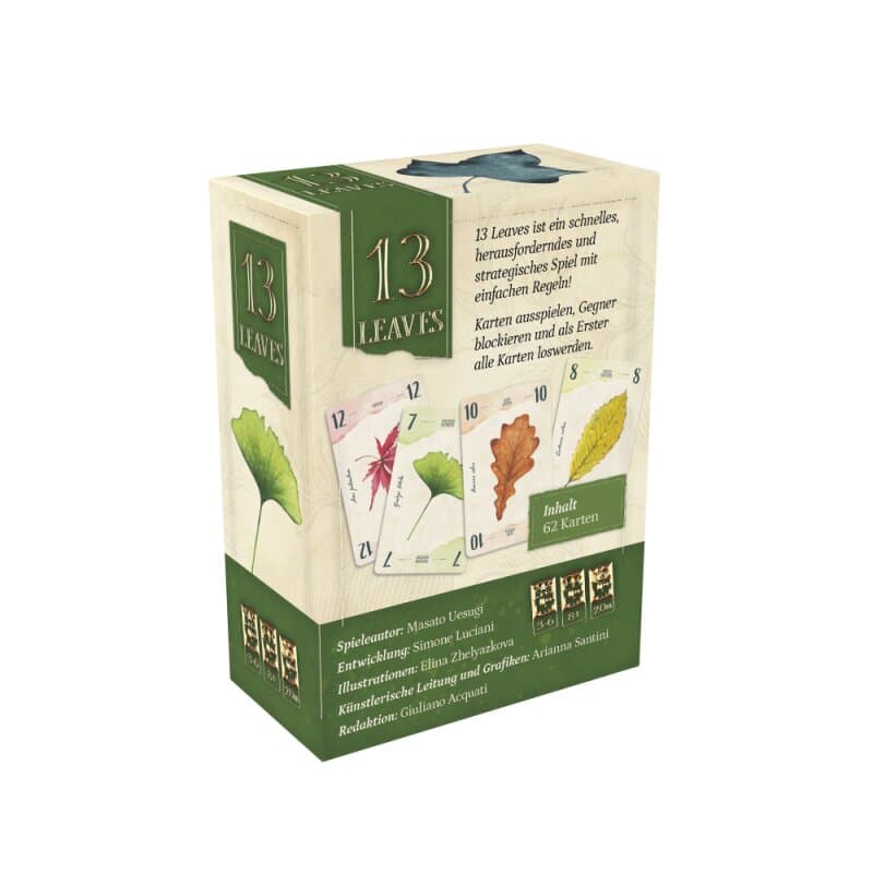 Der Herbst hat begonnen, und mit ihm kommt das große Rascheln im Laub! In 13 Leaves liefern sich die Spieler einen packenden Wettstreit darum, wer als Erster alle Blätter abgelegt hat. Doch Vorsicht: Jedes abgelegte Blatt kann den Mitspielern neue Möglichkeiten eröffnen. Nutzt die richtige Zahl zur richtigen Zeit – und passt auf, wann es besser ist, zu passen!