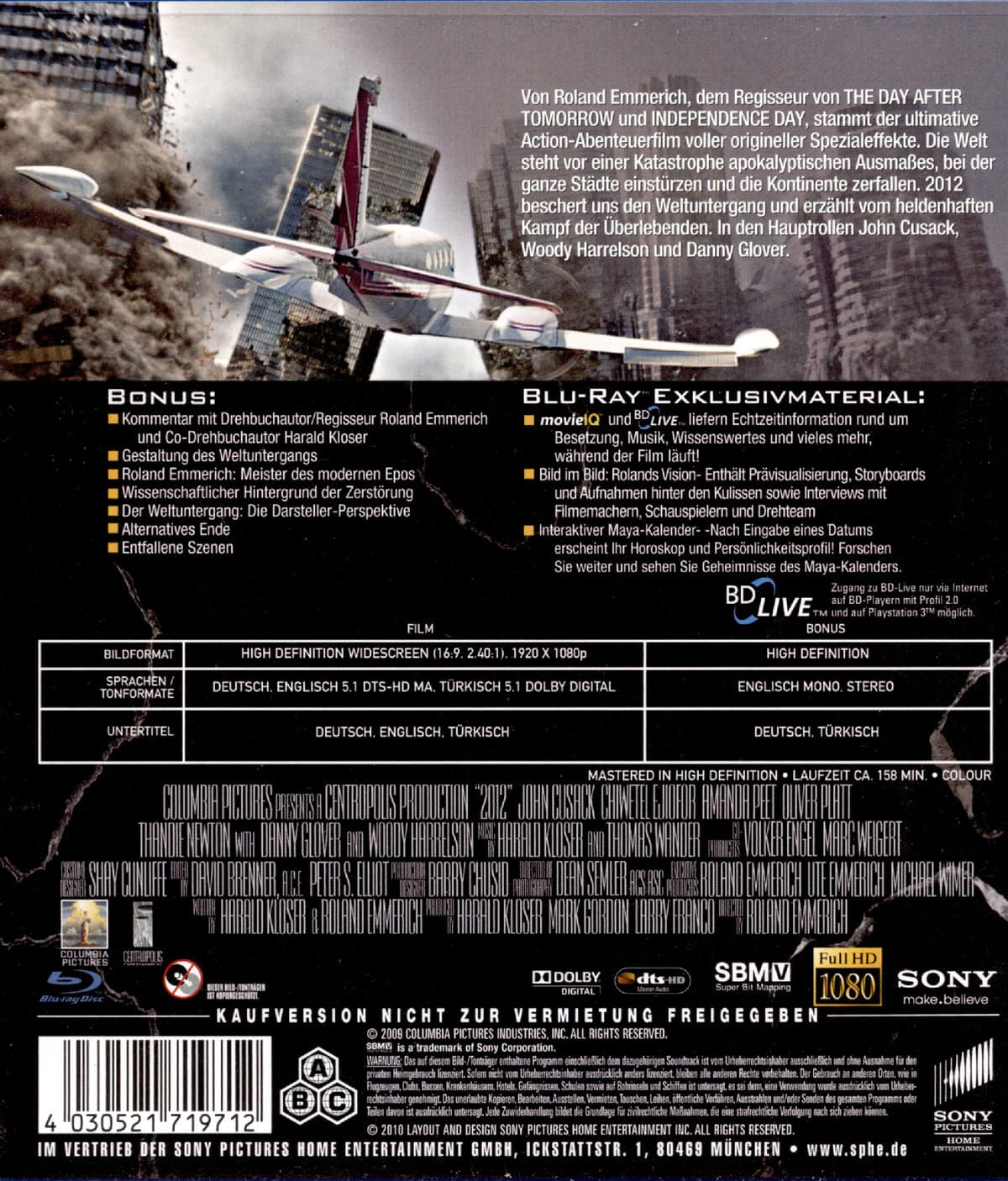 | Zusatzinfos / Bonusmaterial beim Film dabei | Kommentar mit Drehbuchautor/Regisseur Roland Emmerich und Co-Drehbuchautor Harald Kloser; Gestaltung des Weltuntergangs; Roland Emmerich: Meister des modernen Epos; Wissenschaftlicher Hintergrund der Zerstörung; Der Weltuntergang: Die Darsteller-Perspektive; Alternatives Ende; Entfallene Szenen; BD-Live; Movie IQ; Bild-im-Bild; Interaktiver Maya-Kalender; |