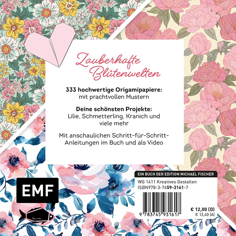 Hier treffen zauberhafte Blumenmuster auf traditionelle Faltkunst: Detailreiche Muster verleihen den Origami einen edlen Touch. So entstehen tolle Figuren wie Kranich, Schmetterling und Lilie mit besonderer Musterung. Die 333 Origamipapiere sind auf 80g-Offsetpapier gedruckt und haben somit die für Origami typische Papiergrammatur und -größe. Die ausführlichen Anleitungen sind sowohl für Anfänger als auch Origami-Experten geeignet.