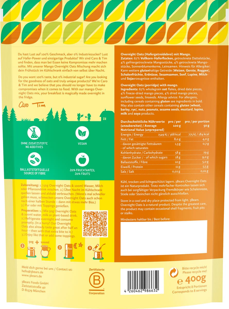 | Zubereitungshinweis | 1. 50g Overnight Oats & 100ml Wasser, Milch oder Pflanzendrink mischen. 2. Über Nacht im Kühlschrank quellen lassen. Wenn’s mal schneller gehen muss, schmecken unsere Overnight Oats auch schon nach einer halben Stunde–dann mit etwas mehr Biss. 3. Pur oder mit Toppings genießen. |