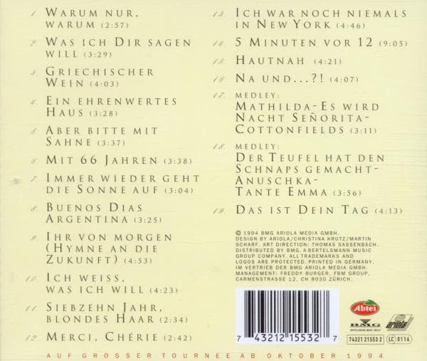 | 18 | Jürgens, Udo | Medley [Der Teufel hat den Schnaps gemacht / Anuschka / Tante Emma] | 00:03:56 | |