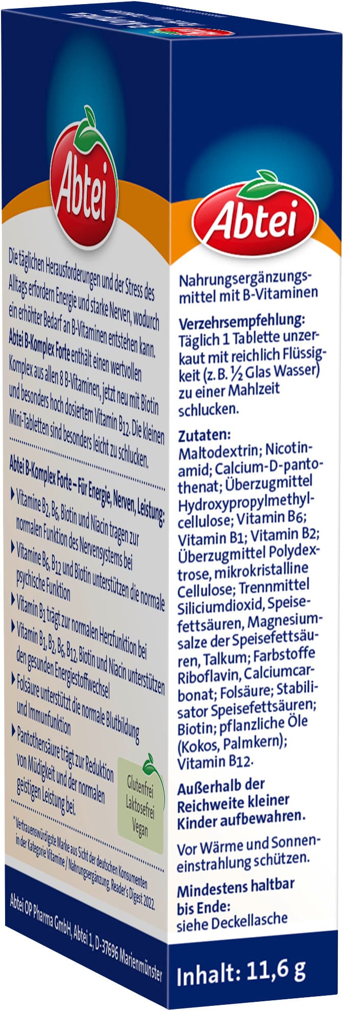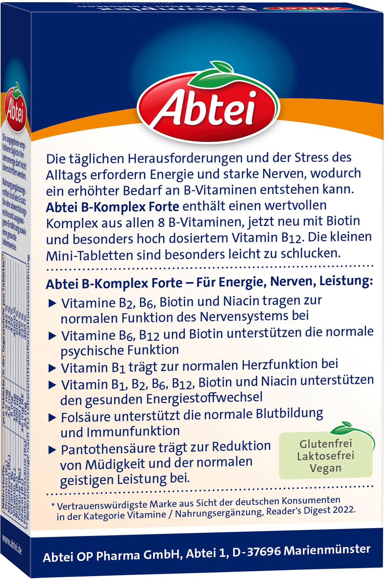 Die täglichen Herausforderungen und der Stress des Alltags erfordern Energie und starke Nerven, wodurch ein erhöhter Bedarf an B-Vitaminen entstehen kann. Abtei B-Komplex Forte enthält einen Komplex aus allen 8 B-Vitaminen, jetzt neu mit Biotin und besonders hochdosiertem Vitamin B12. Die kleinen Mini-Tabletten sind besonders leicht zu schlucken.