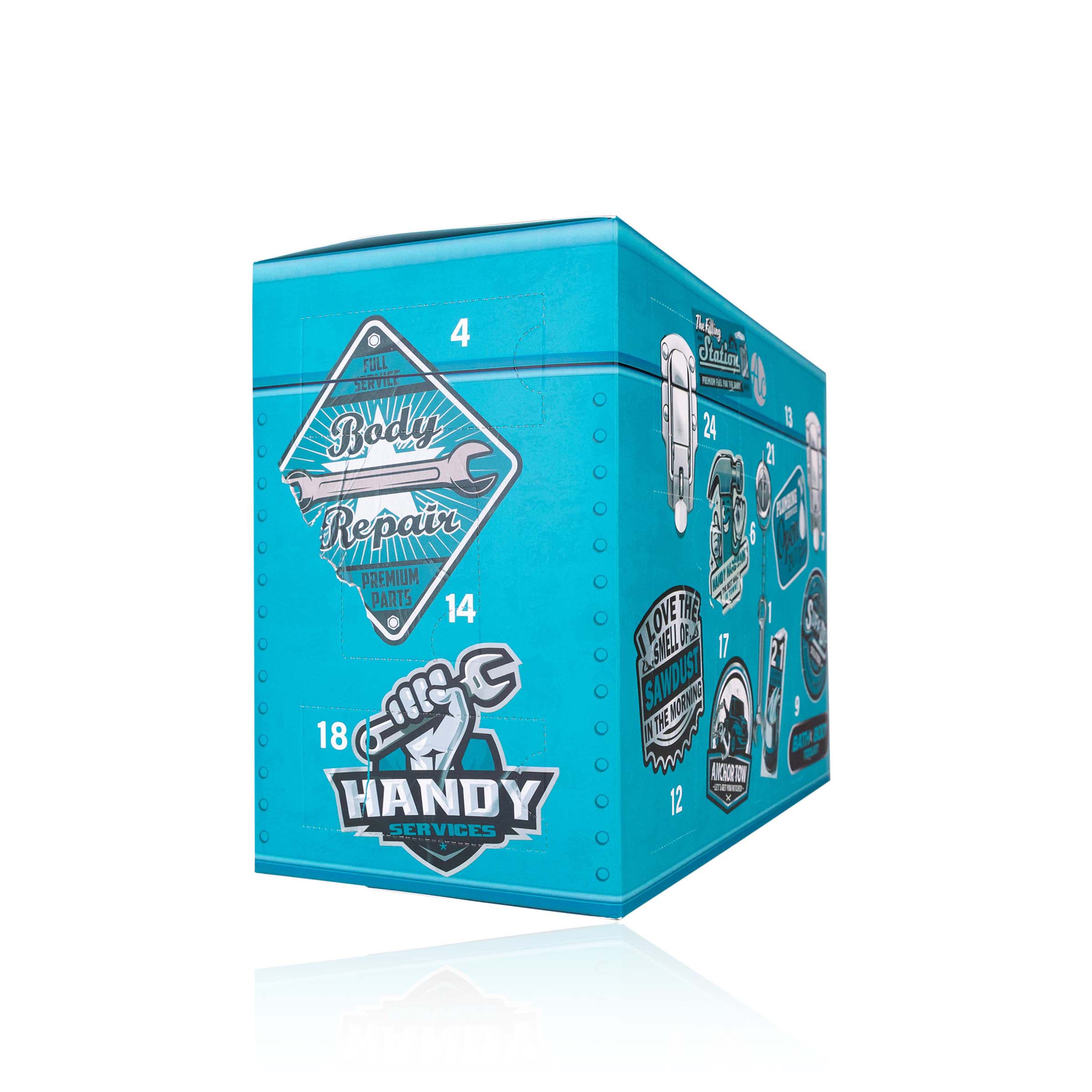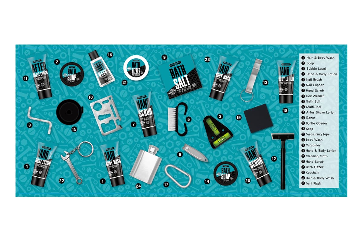 Der Adventskalender BATH & BODY TOOLKIT in der verspielten Werkzeugkoffer-Box aus Papier, ist mit abwechslungsreichen Wellnessprodukten und nützlichen Accessoires befüllt. Hinter 24 Überraschungstürchen verbergen sich sowohl wohlriechende und pflegende kosmetische Produkte, als auch kleine Werkzeuggadgets – Ideal als Geschenk für Männer oder alle, die gern praktische und pflegende Elemente kombinieren.