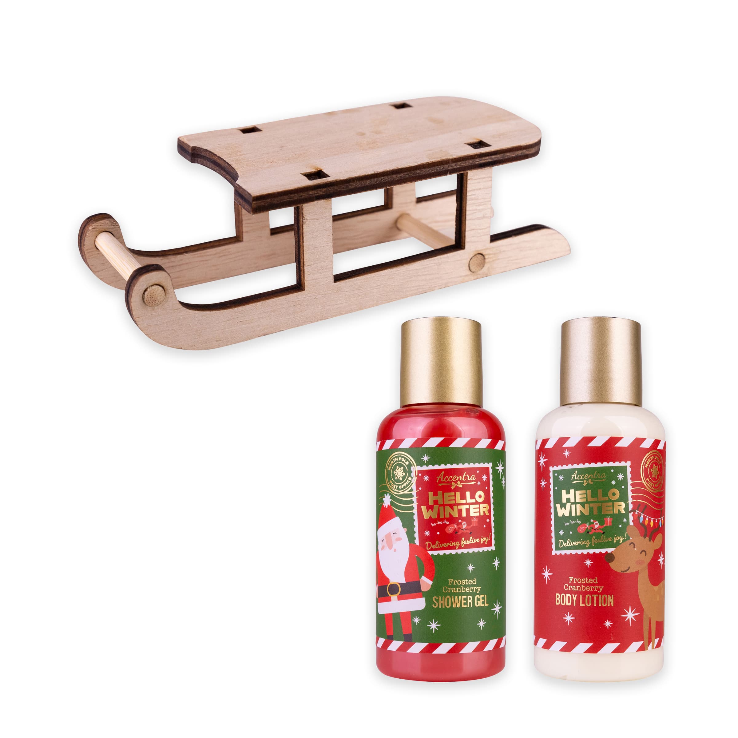 Das hübsche HELLO WINTER Badeset besteht aus einem Duschgel und einer Bodylotion mit je 100ml Inhalt. Der herrlich frische Duft nach Frosted Cranberry wird begeistern. Das weihnachtliche Set in den klassischen Farben Rot, Grün und Gold sieht auf dem kleinen Deko-Holzschlitten einfach bezaubernd aus. Ein ideales Geschenk zur Weihnachtszeit!