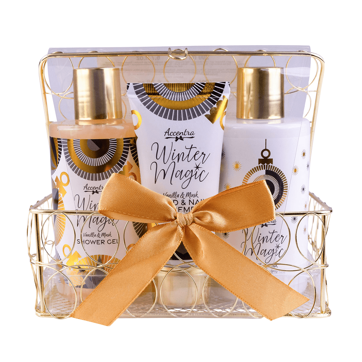 Dieses edle WINTER MAGIC Geschenkset in den Farben Gold, Weiß und Schwarz im schönen, wiederverwendbarem Drahtkorb enthält drei wunderschöne Produkte: ein 200ml Duschgel, eine 200ml Bodylotion und eine 60ml Hand- und Nagelcreme mit jeweils luxuriöser Vanilla-Musk-Duftnote. Ein 15g Netzschwamm rundet das Dusch- und Pflegeset ab. Ein praktisches und vor allem stilvolles Geschenk!