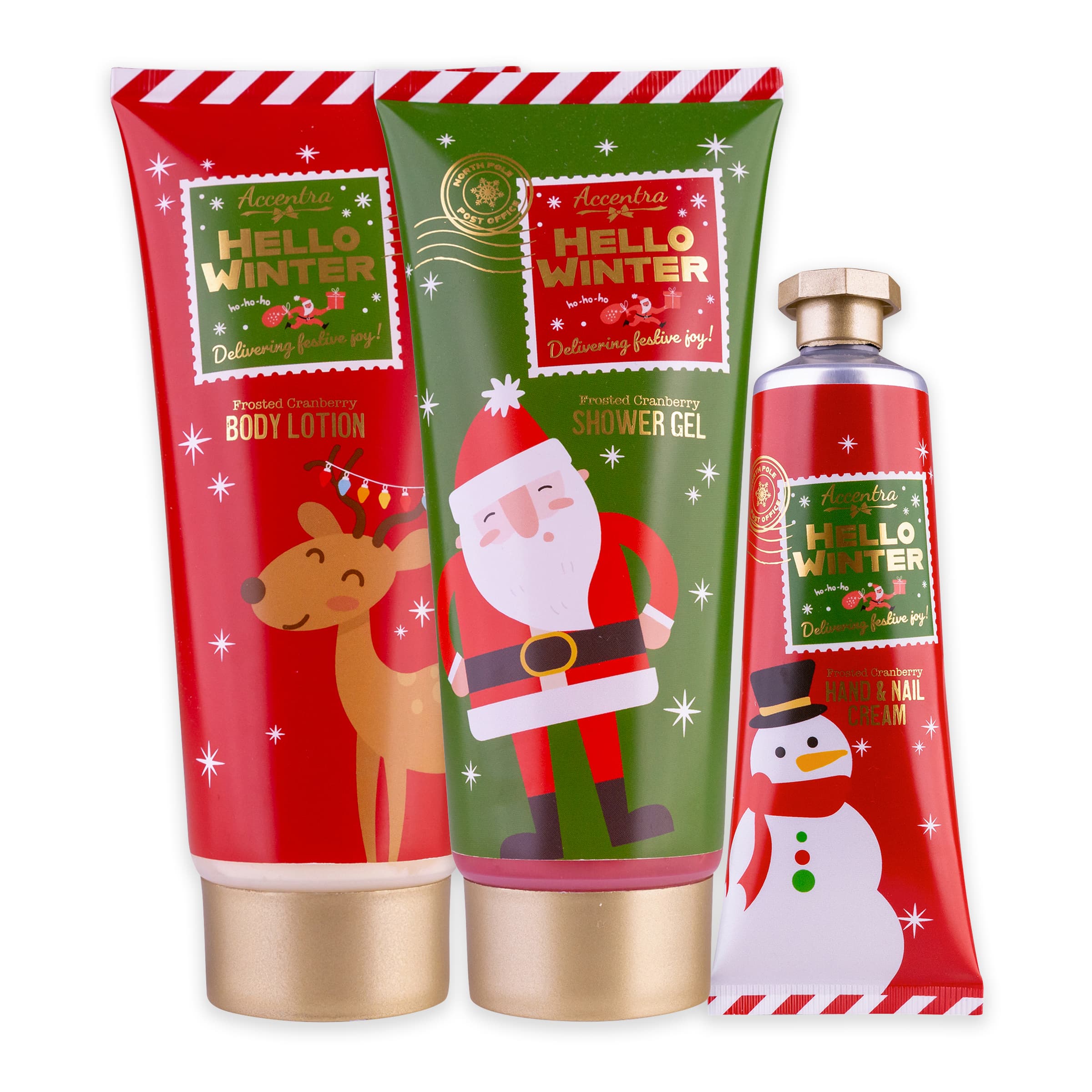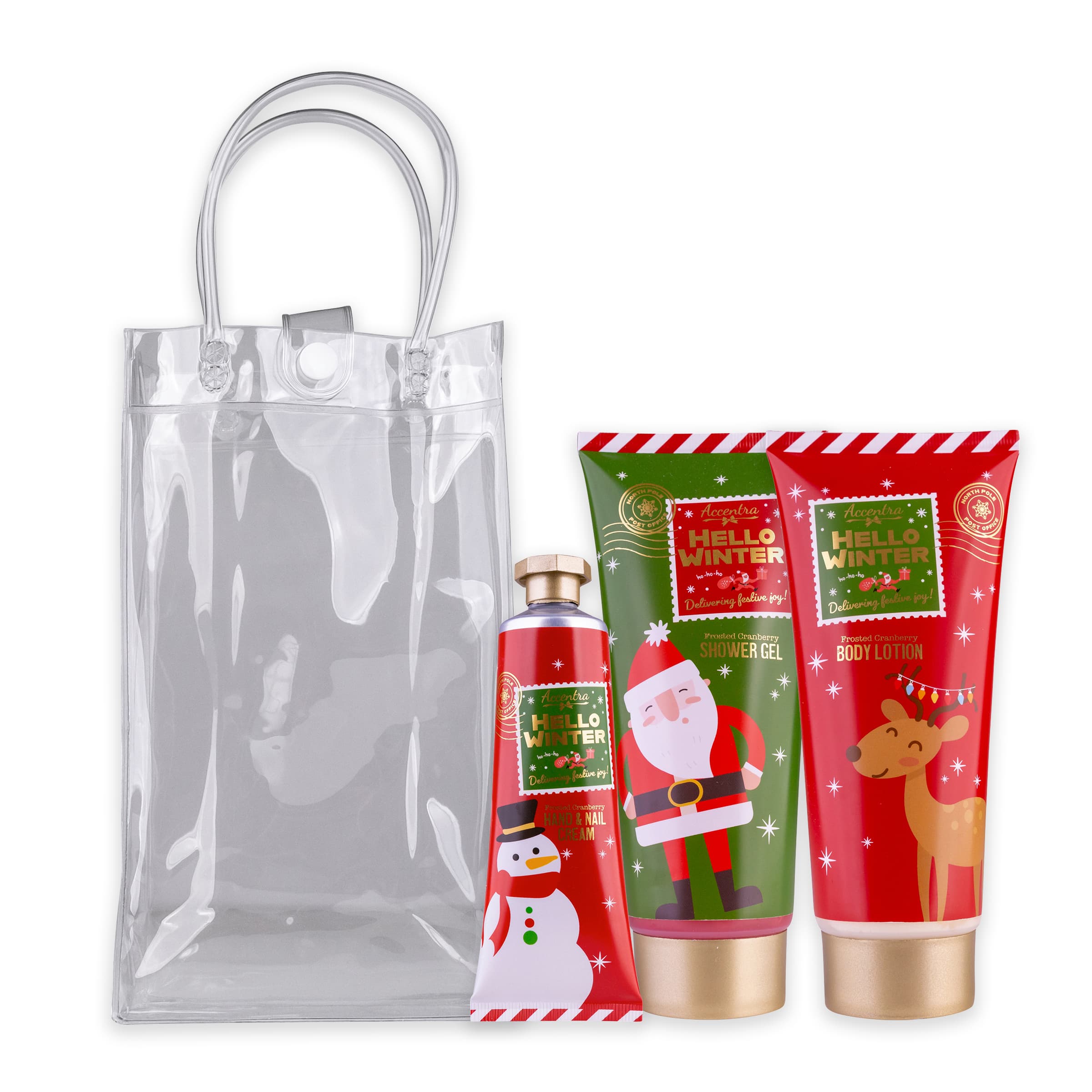Dieses zauberhafte HELLO WINTER Geschenkset in den klassischen weihnachtlichen Farben Rot, Grün und Gold ist ein wahrer Blickfang. Der herrlich frische Duft nach Frosted Cranberry verzaubert die Sinne. Das Set ist in einer transparenten Tragetasche verpackt und eignet sich perfekt als schönes Geschenk.