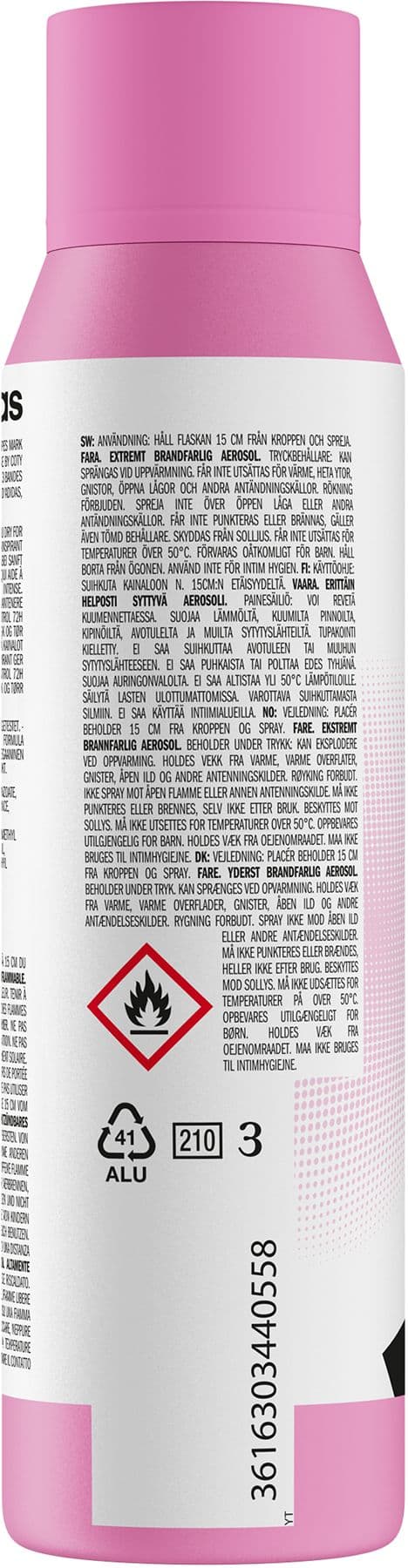 AnwendungshinweisNach dem Öffnen innerhalb von 36 Monaten verbrauchen. ANWENDUNG: Dose 15 cm vom Körper entfernt halten und sprühen.