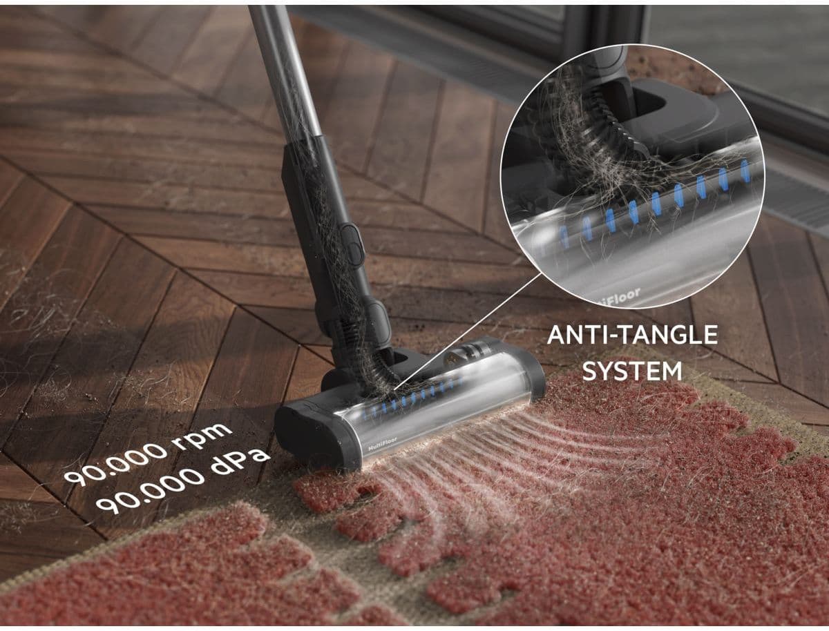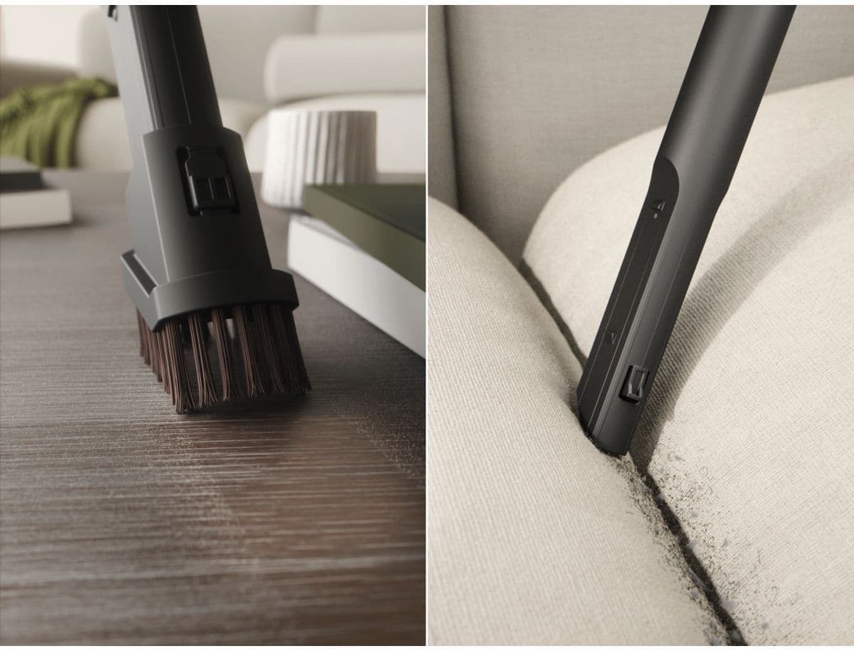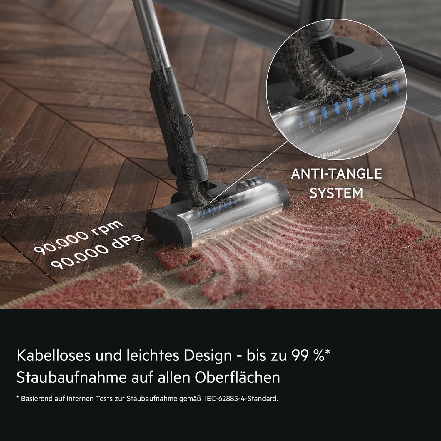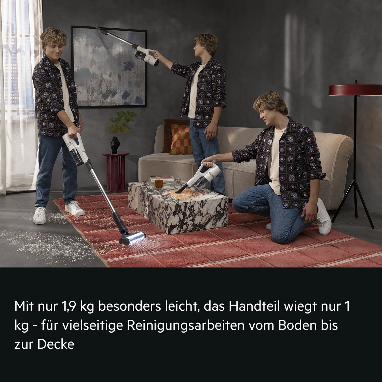 | Sonderfunktion | Starker Digital-Motor und kraftvolle MultiFloor-Bodendüse für alle Böden. Der starke Digital Motor und die kraftvolle MultiFloor-Bodendüse eignen sich für Teppiche und Hartböden. Die LED-Leuchten machen versteckten Staub sichtbar und das Anti-Tangle-System reduziert ein verheddern von Haaren auf der Bürstenrolle und vereinfacht die Gerätepflege. Schnelle Staubentleerung in einem Schritt. Einfache und schnelle Entleerung des Staubbehälters per Knopfdruck. Die Ein-Schritt Entleerung befördert den Staub direkt in den Abfallbehälter einfach und schnell. Leicht und vielseitig. Mit nur 1,9 kg ist dieser kabellose Handstaubsauger besonders leicht und komfortabel. Das Handteilwiegt sogar nur 1 kg. Er eignet sich ideal für vielseitige Reinigungsarbeiten vom Boden bis zur Decke. Mit dem Handteil und dem enthaltenen Zubehör lassen sich Tische, Regale, Arbeitsplatten und vieles mehr einfach, schnell und schonend reinigen. |