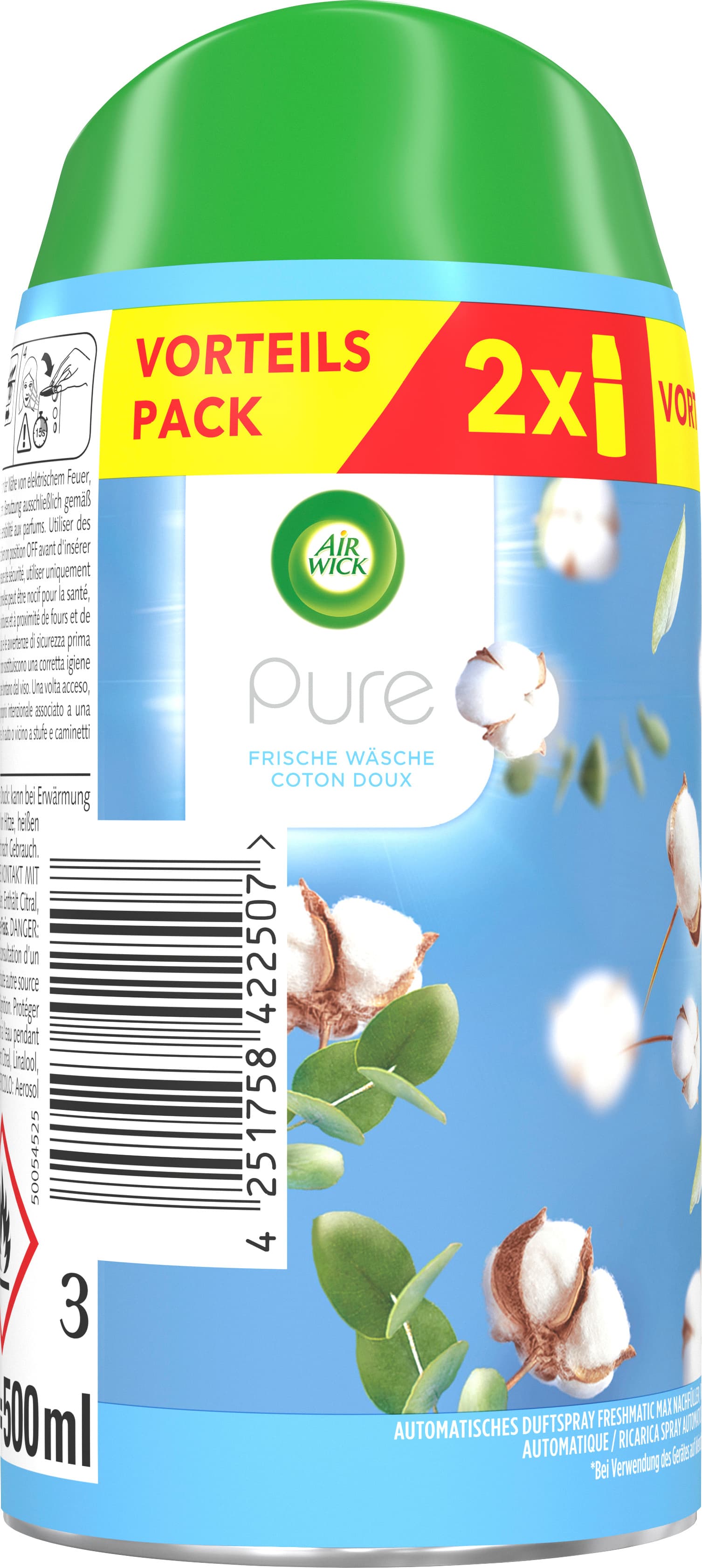 Air Wick Freshmatic Max Nachfüller DUO PURE Frische Wäsche - Entdecken Sie den wunderbar sanften Duft von frisch gewaschener Wäsche, der zum Träumen einlädt. Dank seiner Formel ohne zusätzliches Wasser neutralisiert PURE unangenehme Gerüche ohne feuchten Niederschlag und hinterlässt nichts als einen frischen, angenehmen Duft in Ihrem Zuhause. Die Air Wick Life Scents-Technologie sorgt durch das Zusammenspiel von 3 Duftkomponenten dafür, dass die Düfte so realitätsnah wie möglich wirken. Es sind die ersten Düfte, die sich kontinuierlich verändern und so ein Dufterlebnis "wie im wahren Leben" ermöglichen. Das Air Wick Freshmatic Gerät ist ein automatisches Duftspray, das selbstständig und kontinuierlich hochwertige Düfte abgibt. So neutralisiert Air Wick Freshmatic Max schlechte Gerüche und bietet Ihnen ein angenehmes Dufterlebnis für bis zu 70 Tage pro Nachfüller.