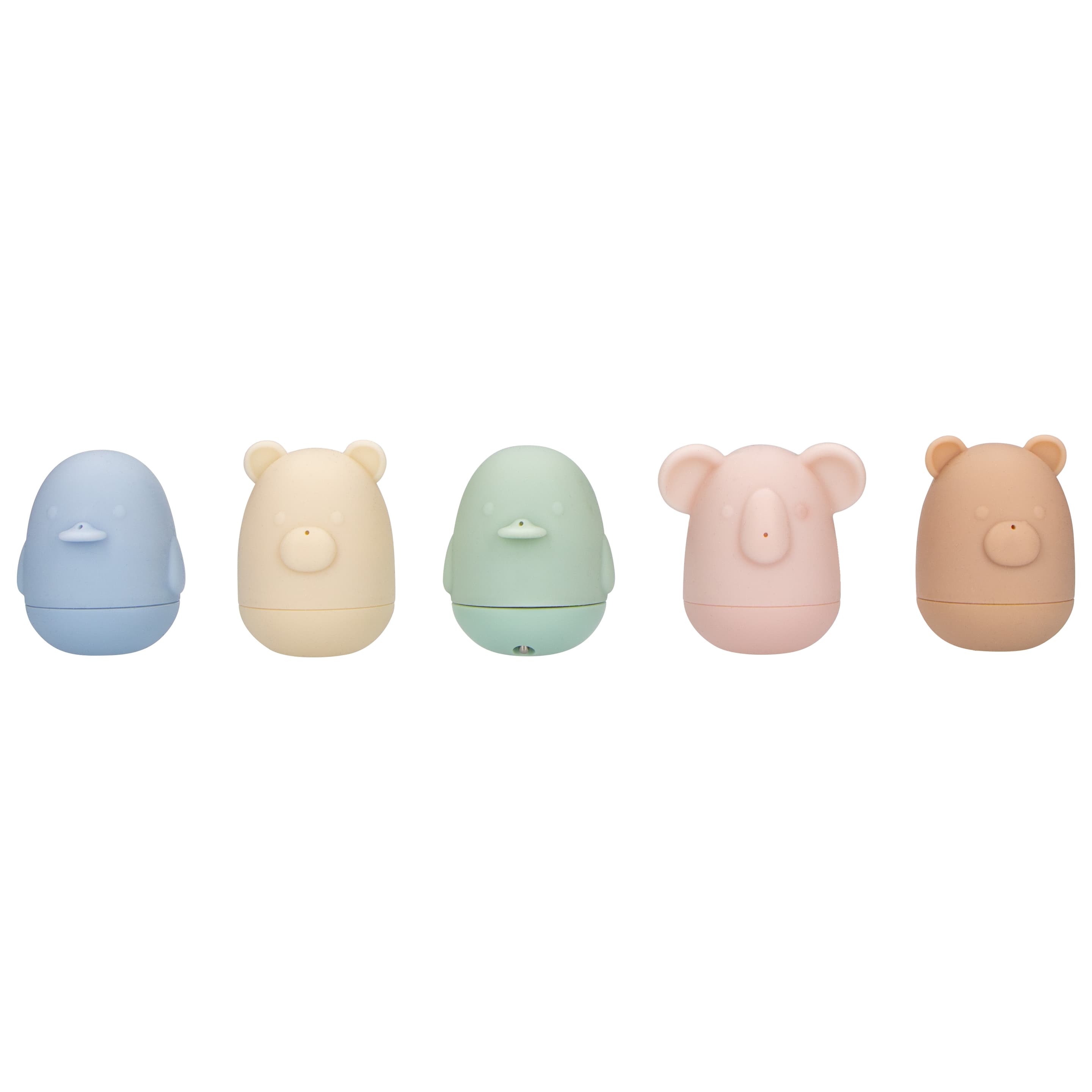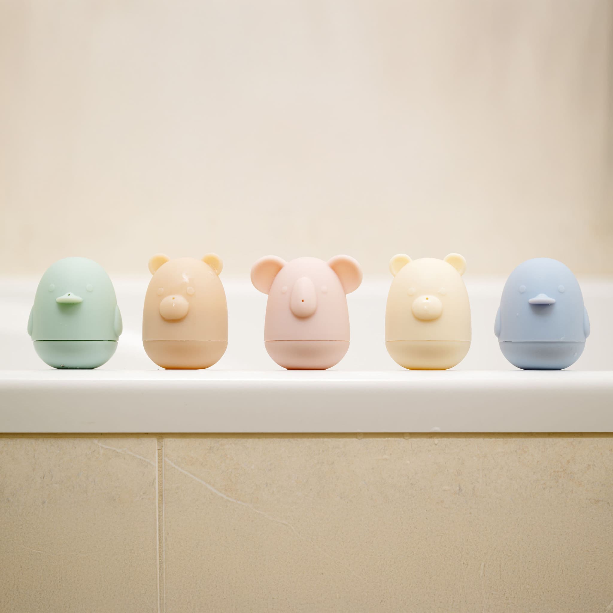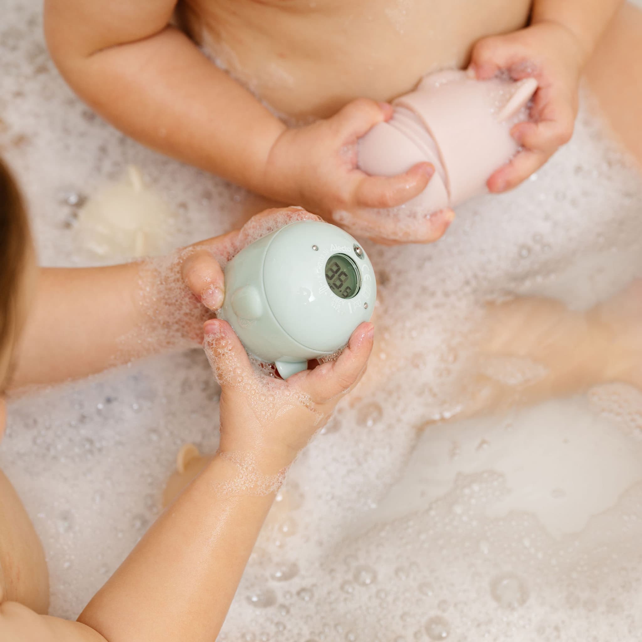 Set aus fünf bunten Badespielzeugen mit Thermometer - Badewannenspielzeug für Babys und Kinder.