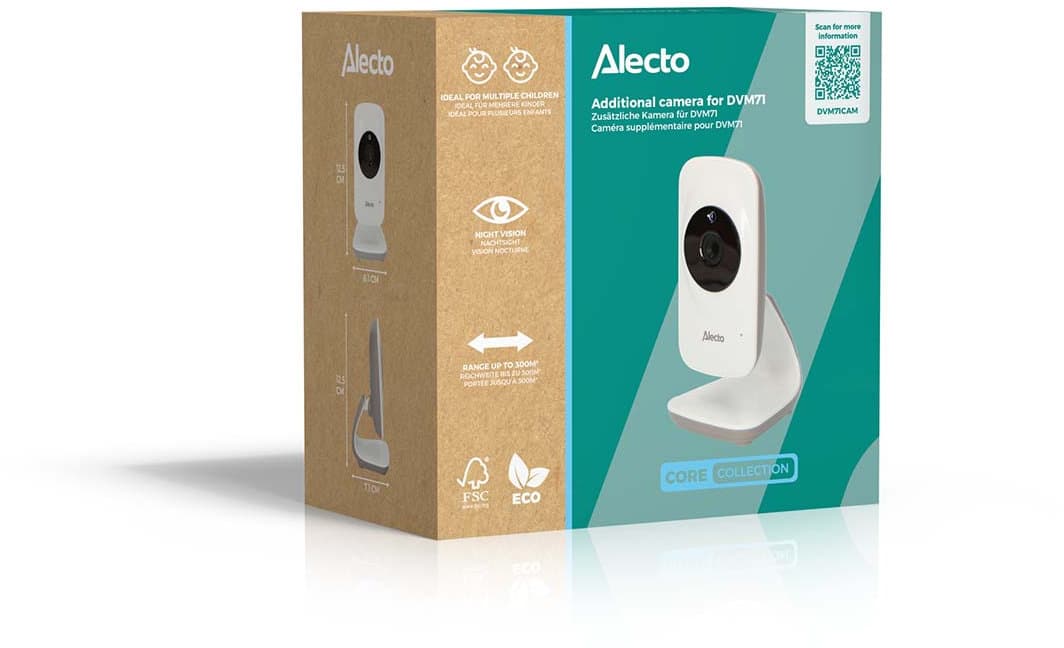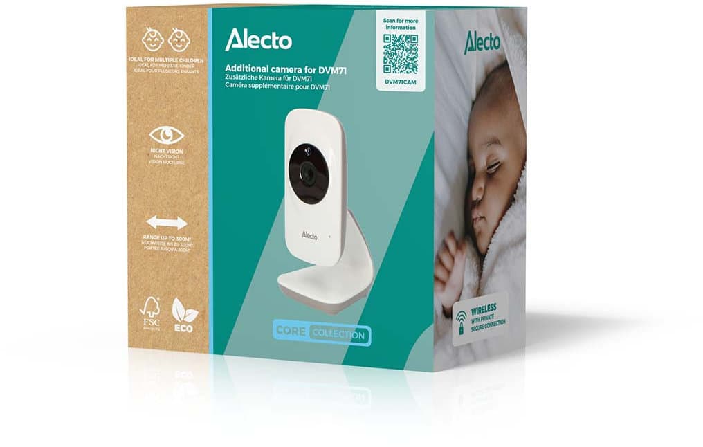 Die Alecto DVM71CAM ist eine zusätzliche Kamera zur Erweiterung der Video-Babyüberwachungssysteme Alecto DVM71 und DVM71BLACK. Diese Systeme werden standardmäßig mit einer Elterneinheit und einer Kamera geliefert. Mit der DVM71CAM können zusätzliche Überwachungspunkte hinzugefügt werden, ohne dass die vorhandene Einrichtung ersetzt werden muss. Eine einzige Elterneinheit kann mit bis zu vier Kameras verbunden werden, was eine flexible Überwachung in Haushalten mit mehreren Kindern oder Räumen ermöglicht.