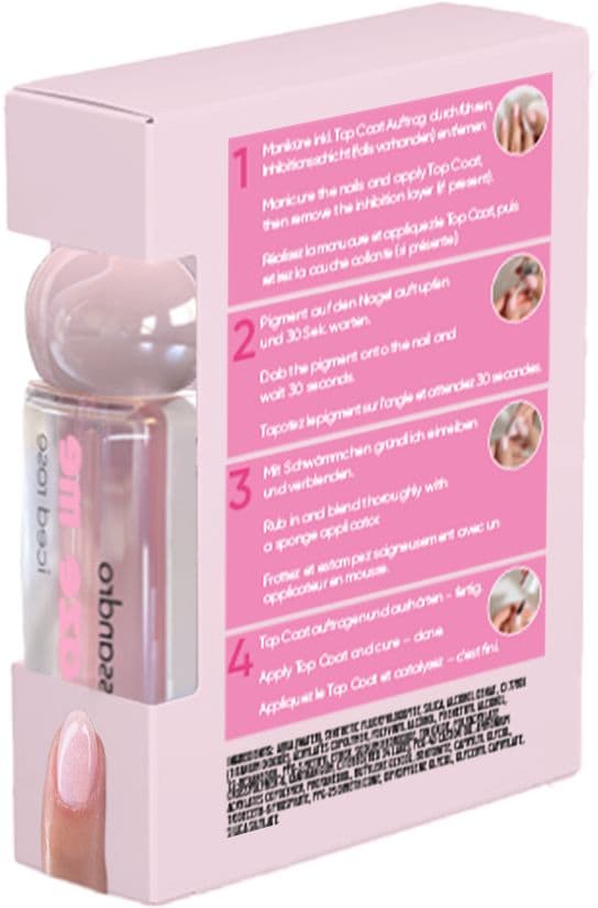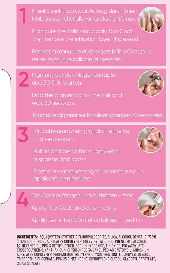 | Anwendungshinweis | 1. Nägel wie gewohnt vorbereiten, lackieren und die Schwitzschicht entfernen. 2. Glaze Me Pigment auf den Nagel tupfen und ca. 30 Sekunden antrocknen lassen. 3. Mit dem beiliegenden Schwämmchen das Pigment gleichmäßig verteilen und in kreisenden Bewegungen einarbeiten, bis ein strahlender Glanz entsteht. 4. Zum Abschluss mit einem Top Coat deiner Wahl versiegeln (bei UV/LED ggf. aushärten und die Schwitzschicht entfernen). Fertig! |