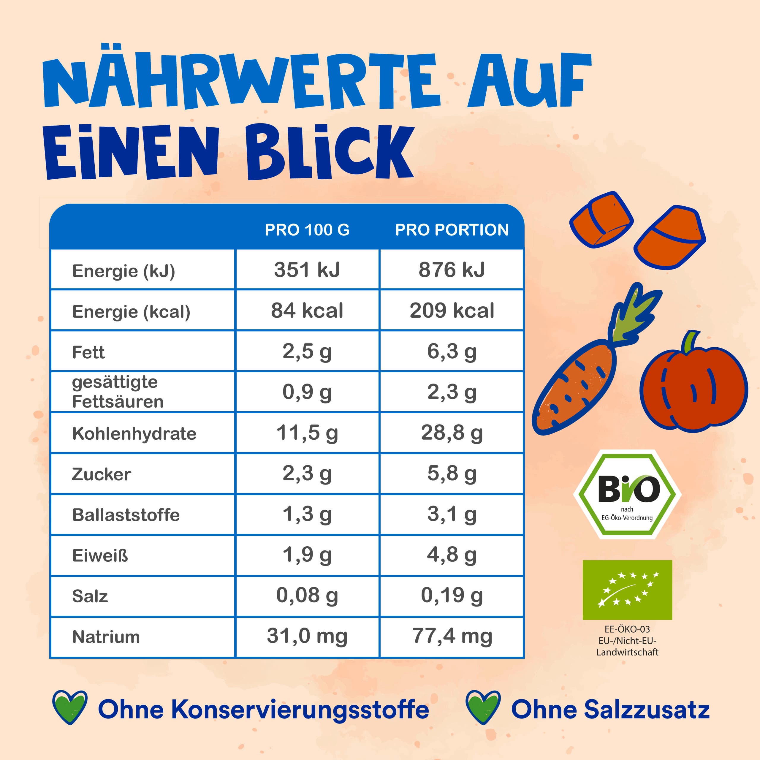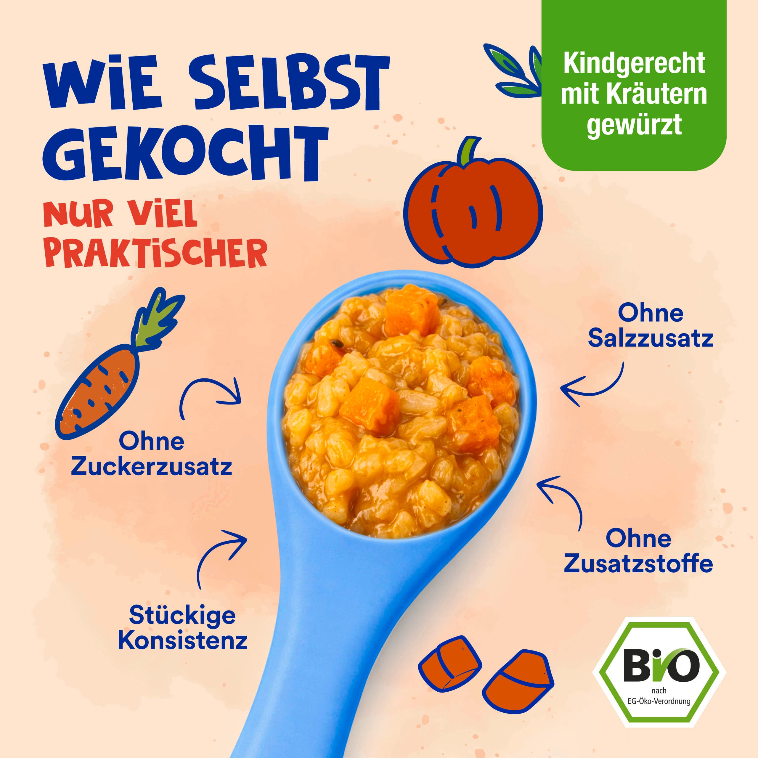 | Zutaten | Zutaten: Kürbis* 25%, Wasser, Reis* gekocht (Wasser, Reis*) 18%, Karotten* 10%, Zwiebeln*, Süßkartoffeln* 7%, HARTKÄSE* 5%, Rapsöl*, Kartoffelstärke*, Knoblauch*, Paprikapulver*, Petersilie*, schwarzer Pfeffer*. *aus kontrolliert biologischer Landwirtschaft |