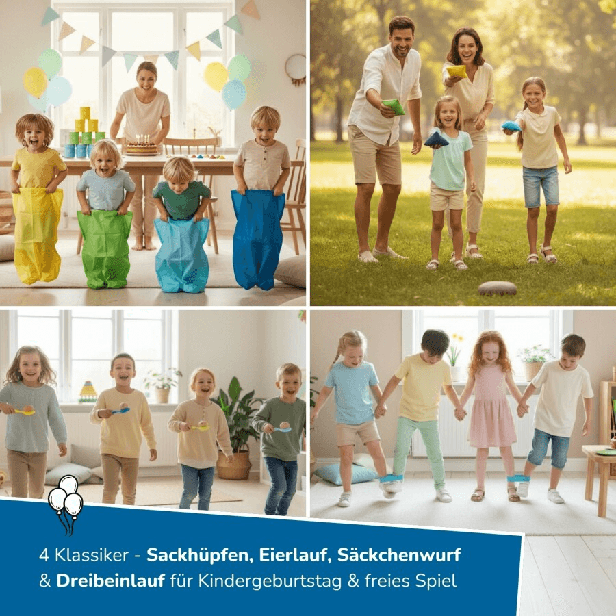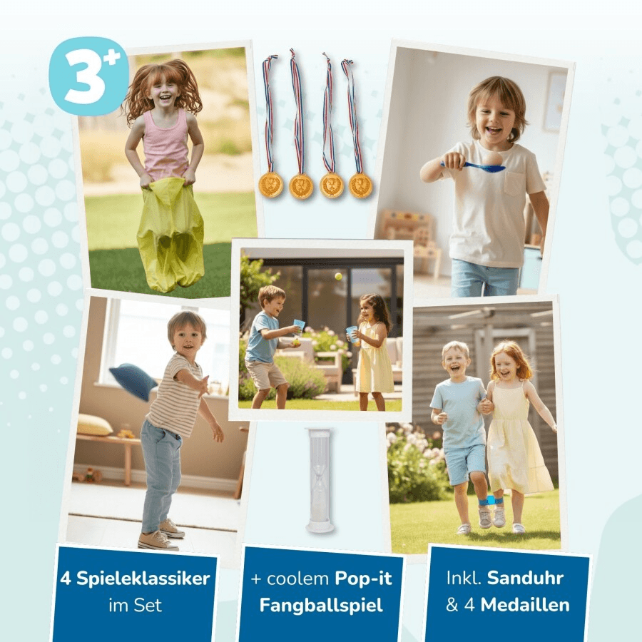 Ob beim Sprinten im Sackhüpfen, beim konzentrierten Eierlauf, im Team beim Dreibeinlauf oder beim Treffsicherheits‑Wettbewerb im Säckchenwurf – dieses XXL Spiel‑Set fördert spielerisch Bewegung, Teamfähigkeit, Balance, Koordination und Geschicklichkeit. Auch das Pop‑it Ballspiel sorgt mit seinem Mix aus Fang‑ und Zielspiel für zusätzliche Begeisterung. Perfekt für Kindergeburtstage, Schulveranstaltungen, Familienfeiern und Bewegungsangebote aller Art.