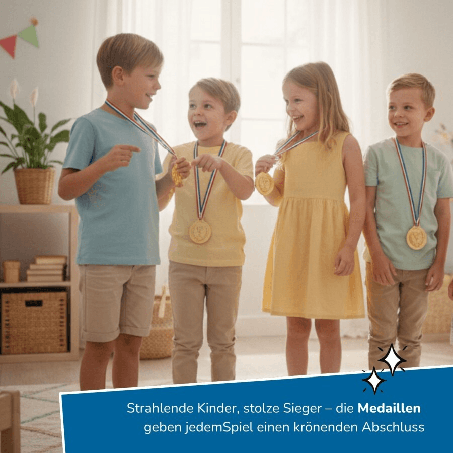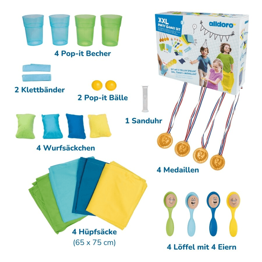 Mit Hüpfsäcken, Löffeln & lustigen Eiern, Wurfsäckchen, Pop‑it Bechern und Bällen, Klettbändern, Sanduhr, 4 Medaillen sowie einem praktischen Aufbewahrungsnetz bietet das Set alles, was für spannende Wettkämpfe benötigt wird. Die robusten Materialien sind für den Indoor‑ und Outdoor‑Einsatz geeignet und halten auch wilden Spielrunden problemlos stand.
