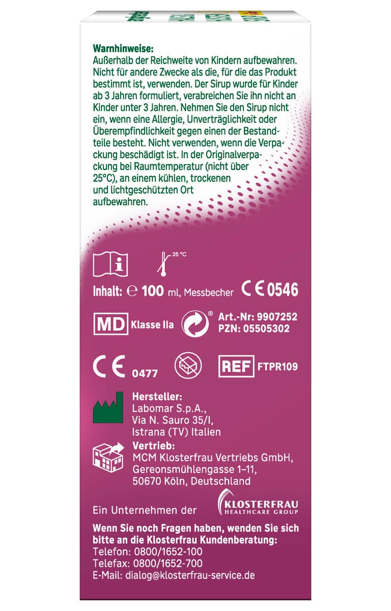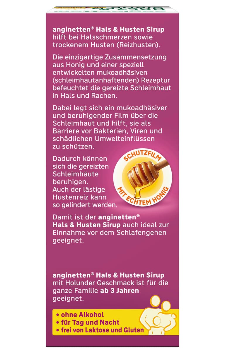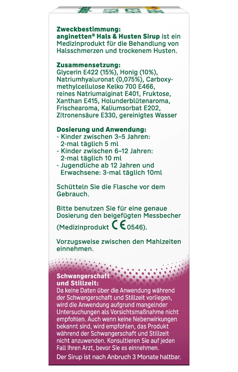 Zweckbestimmung: anginetten Hals & Husten Sirup ist ein Medizinprodukt für die Behandlung von Halsschmerzen und trockenem Husten. * Wenn Sie nach einer kurzen Behandlungsdauer (7 Tage) keine Besserung der Beschwerden feststellen, wenden Sie sich an Ihren Arzt. In jedem Fall sollten Sie das präparat nicht länger als 15 Tage anwenden. * Überschreiten Sie nicht die empfohlene Tagesdosis. * Nehmen Sie es nicht ein, wenn eine Allergie, Unverträglichkeit oder Überempfindlichkeit gegen einen der Bestandteile besteht. * Verwenden Sie das Produkt nicht nach dem auf der Packung aufgedruckten Verfallsdatum. * Außerhalb der Reichweite von Kindern aufbewahren. * Nicht für andere Zwecke als die, für die das Produkt bestimmt ist, verwenden. * Das Verfallsdatum bezieht sich auf das Produkt in der unversehrten Verpackung und bei ordnungsgemäßer Lagerung. * Der Sirup wurde für Kinder ab 3 Jahren formuliert, verabreichen Sie ihn nicht an Kinder unter 3 Jahren. Nebenwirkungen: Es wurden keine Nebenwirkungen im Zusammenhang mit der Verwendung des Medizinproduktes beobachtet. Wenn Sie das Auftreten von Nebenwirkungen bemerken, informieren Sie Ihren Arzt. Wechselwirkungen: Jeder schwerwiegende Vorfall, der im Zusammenhang mit dem Produkt aufgetreten ist, sollte dem Hersteller und der zuständigen Behörde gemeldet werden. Im Falle eines unerwünschten Ereignisses sollte stets ärztlicher Rat eingeholt werden. Schwangerschaft und Stillzeit: Da keine Daten zur Anwendung während der Schwangerschaft und Stillzeit vorliegen, wird aus Sicherheitsgründen und aufgrund fehlender Erfahrung von der Anwendung generell abgeraten. Auch wenn keine Nebenwirkungen bekannt sind, wird empfohlen, das Produkt während der Schwangerschaft oder Stillzeit nicht zu verwenden. Konsultieren Sie in jedem Fall vor der Einnahme Ihren Arzt. Kinder zwischen 3-5 Jahren: 2-mal täglich 5 ml Kinder zwischen 6-12 Jahren: 2-mal täglich 10 ml Jugendliche ab 12 Jahren und Erwachsene: 3-mal täglich 10 ml Vorzugsweise zwischen den Mahlzeiten einnehmen.