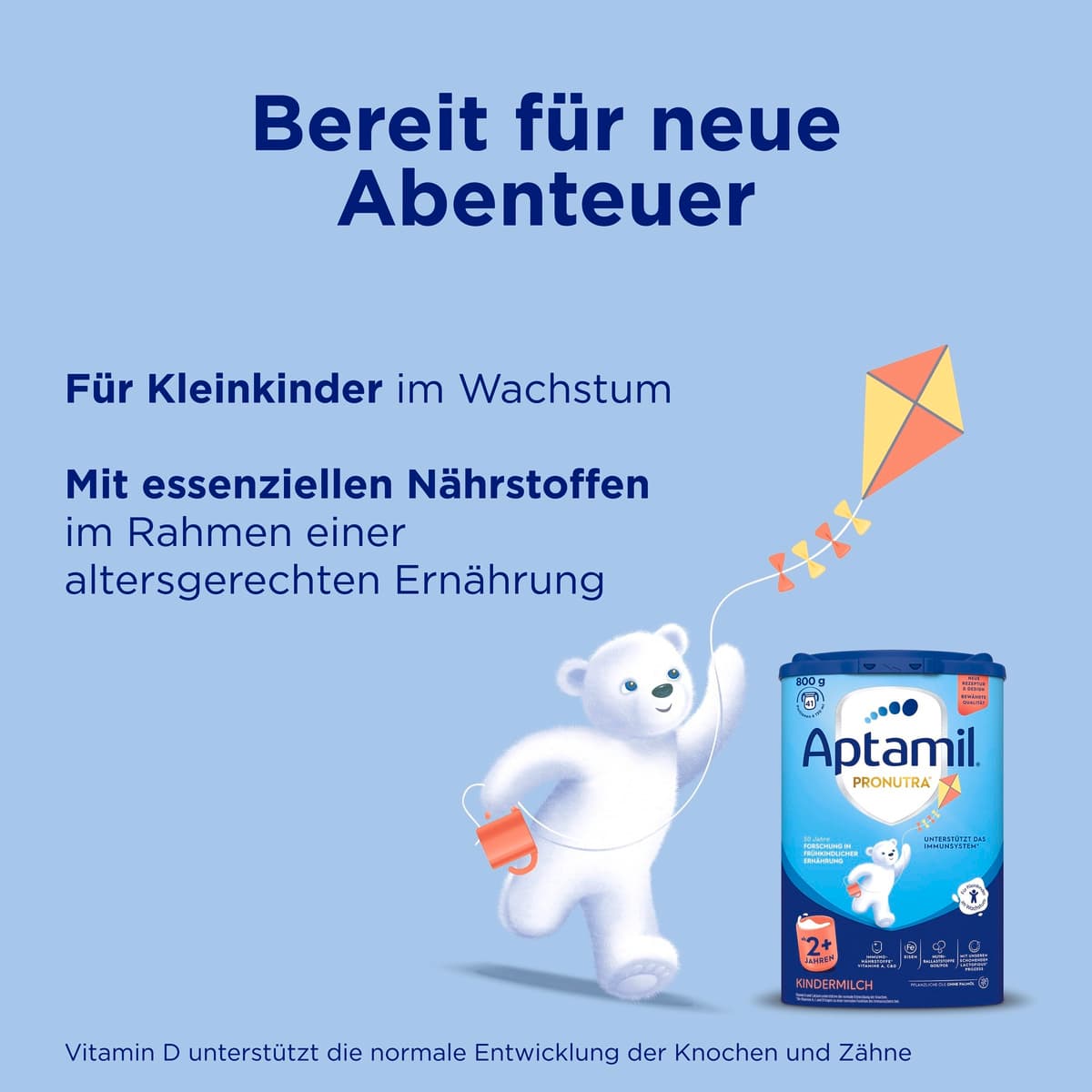 Bereit für neue Abenteuer! Aptamil Kindermilch - basierend auf 50 Jahren Forschung - unterstüzt als Teil der Familienkost Kleinkinder im Rahmen einer altersgerechten Ernährung mit essenziellen Nährstoffen. Was für ein aufregendes Jahr Ihr bereits gemeinsam geschafft habt. Dein Kleines kann jetzt viel mehr: Es wächst so schnell, knüpft erste Kontakte mit anderen Kindern und auch in der Ernährung macht es neue Entdeckungen. Für diese eigenständigen Entdeckungen soll es gut ausgestattet sein. Aptamil Kindermilch 2 Plus Was für ein aufregendes Jahr Sie bereits gemeinsam geschafft haben. Ihr Kleines kann jetzt viel mehr und es ist schön zu sehen, wie es sich weiterentwickelt: Es wächst so schnell, knüpft erste Kontakte mit anderen Kindern und auch in der Ernährung macht es erste Entdeckungen. Für diese zunehmenden und eigenständigen Entdeckungen soll es gut ausgestattet sein. Die Aptamil® Kindermilch unterstützt als Teil der Familienkost Kleinkinder im Rahmen einer altersgerechten Ernährung mit essenziellen Nährstoffen. Ob als gemeinsamer Start in den Tag oder als Abschluss am Abend, Kindermilch bestärkt die Rituale im Alltag. Von Ernährungsexperten entwickelt für Kleinkinder im Wachstum Aptamil Kindermilch 2+ ist geeignet für Kleinkinder in der Wachstumsphase (ab 1 Jahr) und schmeckt kleinen Entdeckern kalt und warm. Aptamil Kindermilch unterstützt das Immunsystem Ihres Kleinkinds mit den Vitaminen A, C und D.