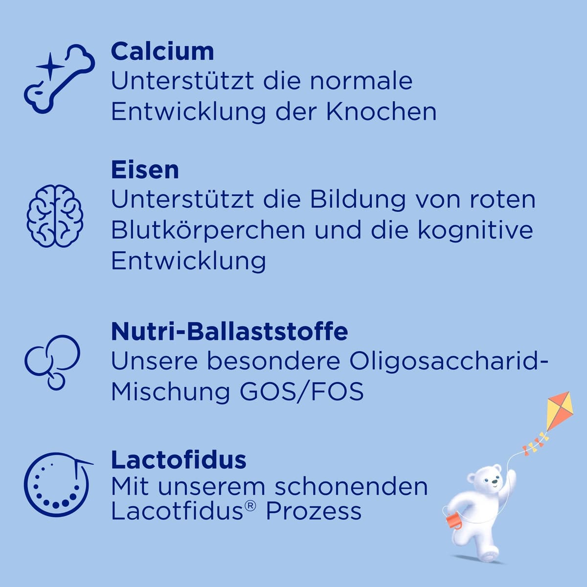 | Zutaten | Laktose (aus MILCH), Galacto-Oligosaccharide (aus MILCH), Molkenerzeugnis (aus MILCH), MAGERMILCH (14%), Sonnenblumenöl (11%), Rapsöl (7%), Calciumorthophosphate, Fructo-Oligosaccharide, Calciumcarbonat, FISCHÖL, Vitamin C,Emulgator (Lecithine), Eisensulfat, Antioxidationsmittel (Ascorbylpalmitat), Vitamin A, Vitamin B2, Kaliumiodid, Vitamin D, Vitamin B12 |