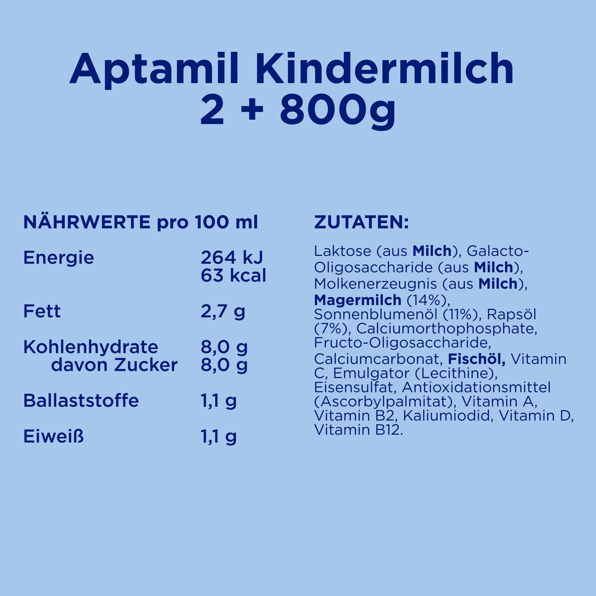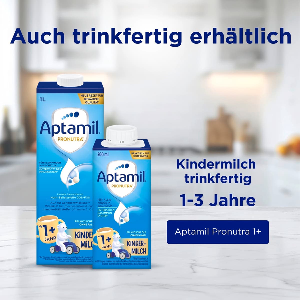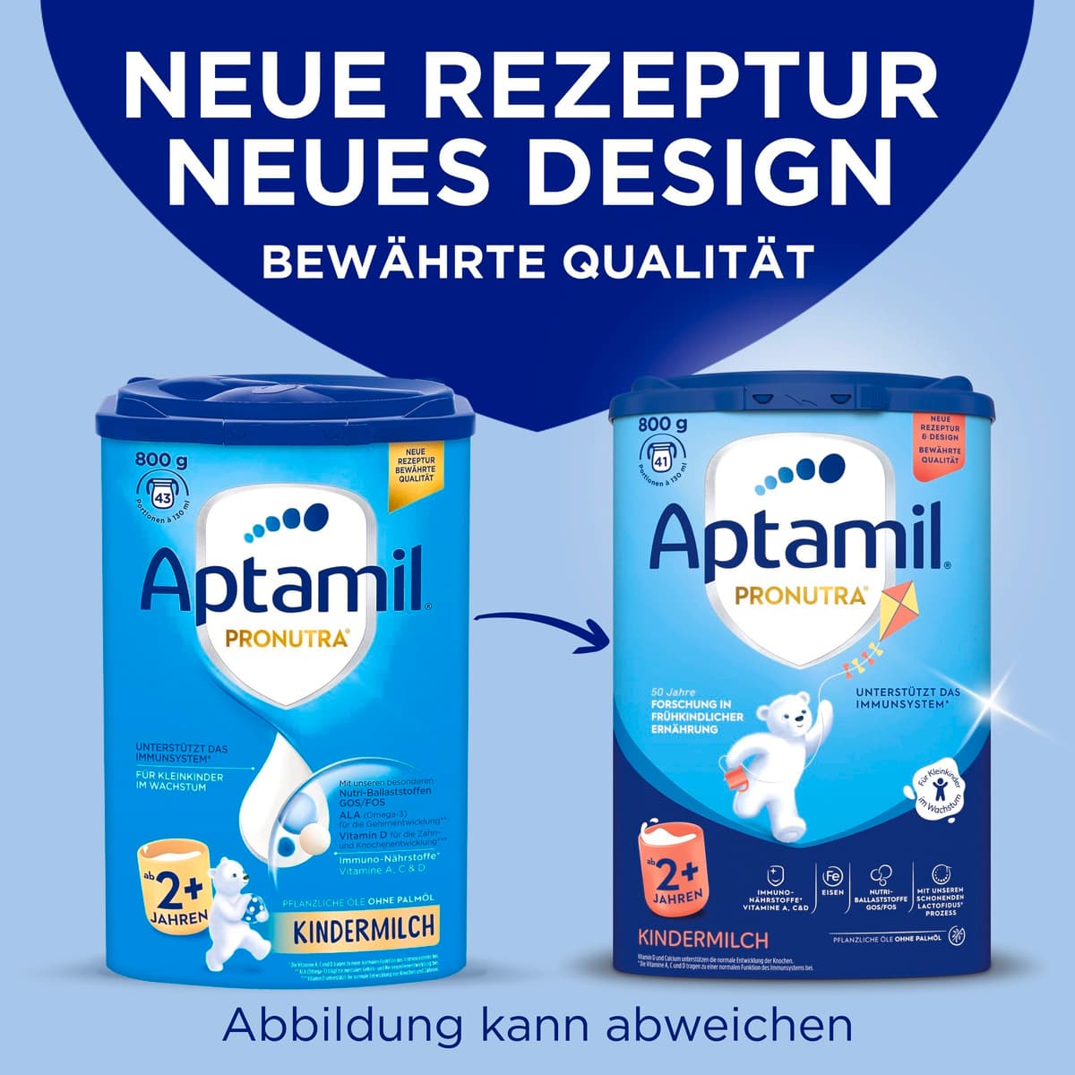 - Aptamil Kindermilch eignet sich für Kleinkinder ab 2 Jahren als Milchgetränk zum Frühstück, Abendessen oder für zwischendurch.