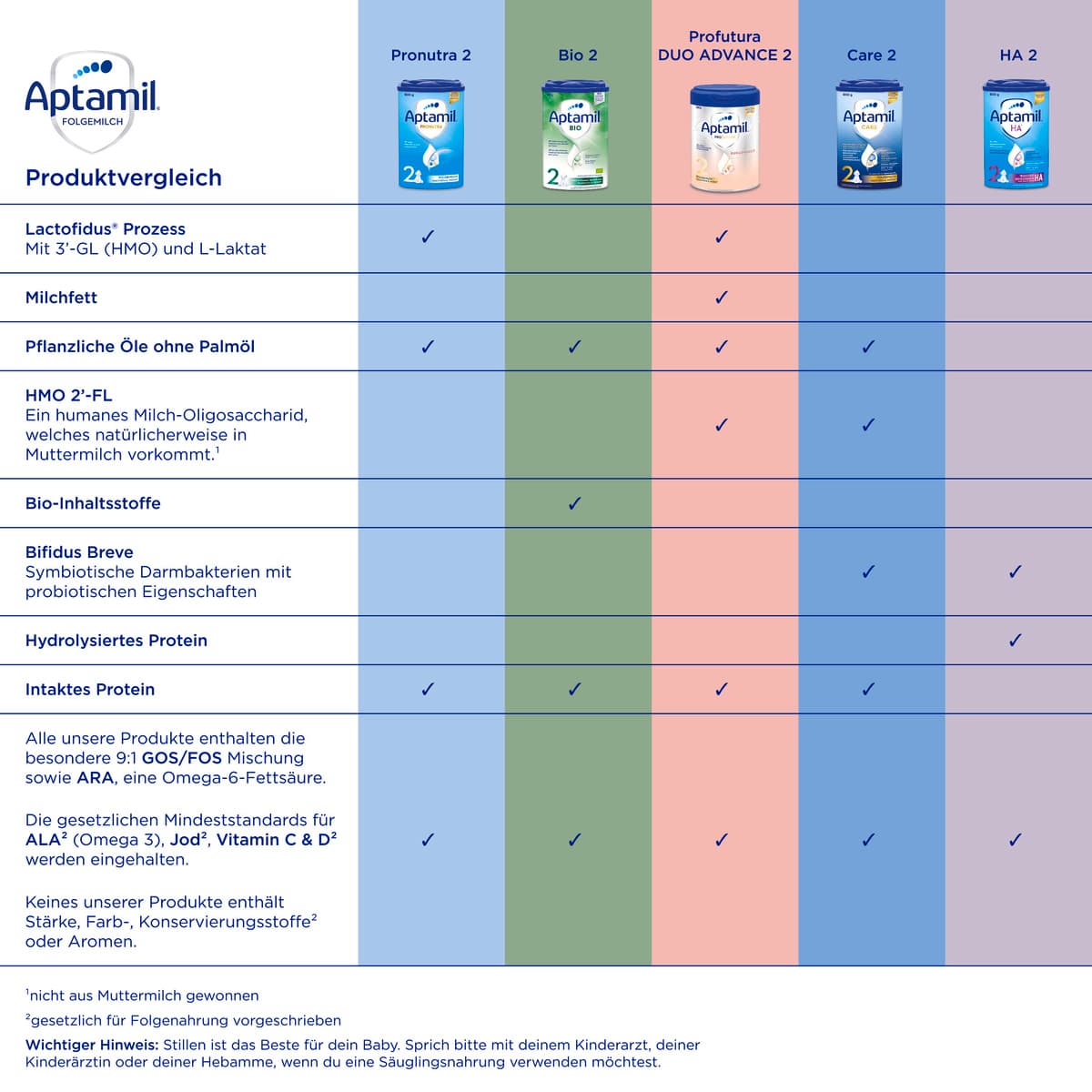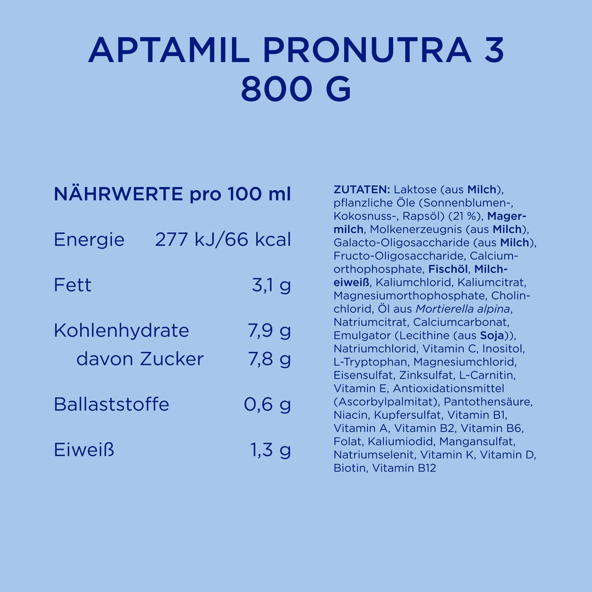 | Zutaten | Laktose (aus MILCH), pflanzliche Öle (Sonnenblumen-, Kokosnuss-, Rapsöl) (21%), MAGERMILCH, Molkenerzeugnis (aus MILCH), Galactooligosaccharide (aus MILCH), Fructooligosaccharide, Calciumorthophosphat, FISCHÖL, Molkeneiweiß (aus MILCH), Kaliumchlorid, Kaliumcitrat, Magnesiumhydrogenphosphat, Cholinchlorid, Öl aus Mortierella alpina, Natriumcitrat, Calciumcarbonat, Emulgator (SOJALECITHIN), Natriumchlorid, Vitamin C, Inositol, L-Tryptophan, Magnesiumchlorid, Eisen-II-sulfat, Zinksulfat, L-Carnitin, Vitamin E, Antioxidationsmittel (Ascorbylpalmitat), Pantothensäure, Niacin, Kupfersulfat, Vitamin B1 Vitamin A, Vitamin B2, Vitamin B6, Folsäure, Kaliumjodid, Mangan-II-sulfat, Natriumselenit, Vitamin K, Vitamin D, Biotin, Vitamin B12. |