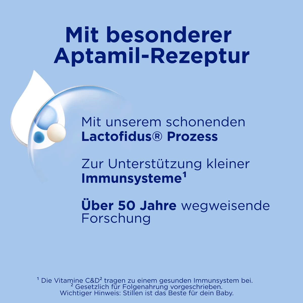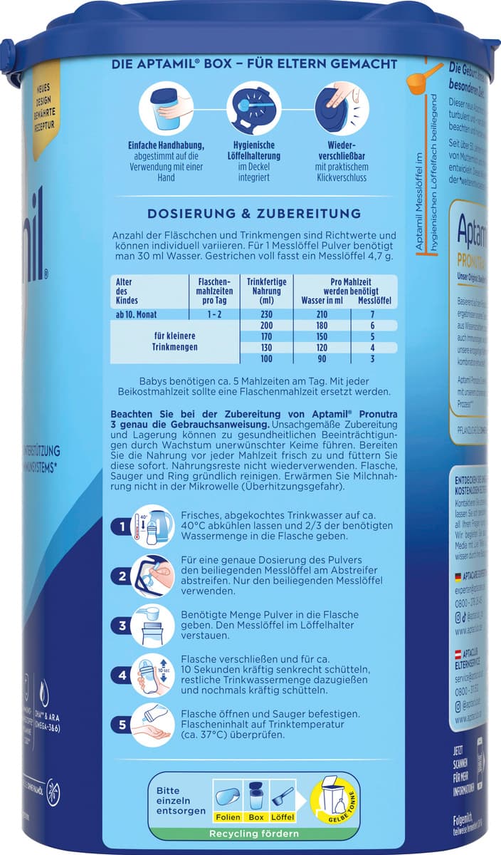 | Zubereitungshinweis | Zubereitung: Beachten Sie bei der Zubereitung von Aptamil 3 genau die Gebrauchsanweisung. Unsachgemäße Zubereitung und Lagerung können zu gesundheitlichen Beeinträchtigungen durch Wachstum unerwünschter Keime führen. Bereiten Sie die Nahrung vor jeder Mahlzeit frisch zu und füttern Sie diese sofort. Nahrungsreste nicht wiederverwenden. Flasche, Sauger und Ring gründlich reinigen. Erwärmen Sie Milchnahrung nicht in der Mikrowelle (Überhitzungsgefahr). 1. Frisches, abgekochtes Trinkwasser auf ca. 40°C abkühlen lassen und 2/3 der benötigten Wassermenge in die Flasche geben. 2. Für eine genaue Dosierung des Pulvers den beiliegenden Messlöffel am Abstreifer abstreifen. Nur den beiliegenden Messlöffel verwenden. 3. Benötigte Menge Pulver in die Flasche geben. Den Messlöffel im Löffelhalter verstauen. 4. Flasche verschließen und für ca. 10 Sekunden kräftig senkrecht schütteln, restliche Trinkwassermenge dazugießen und nochmals kräftig schütteln. 5. Flasche öffnen und Sauger befestigen. Flasch |