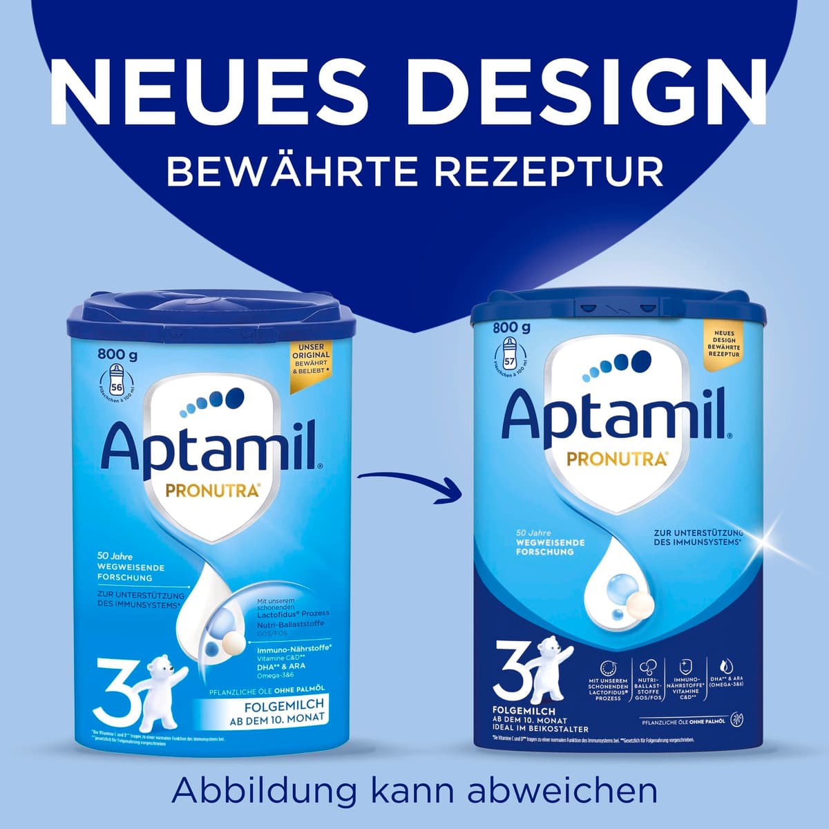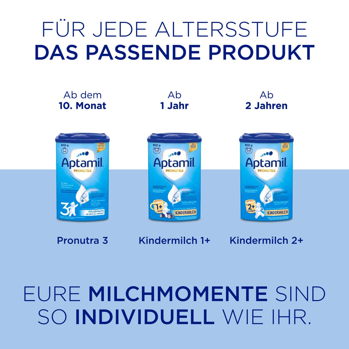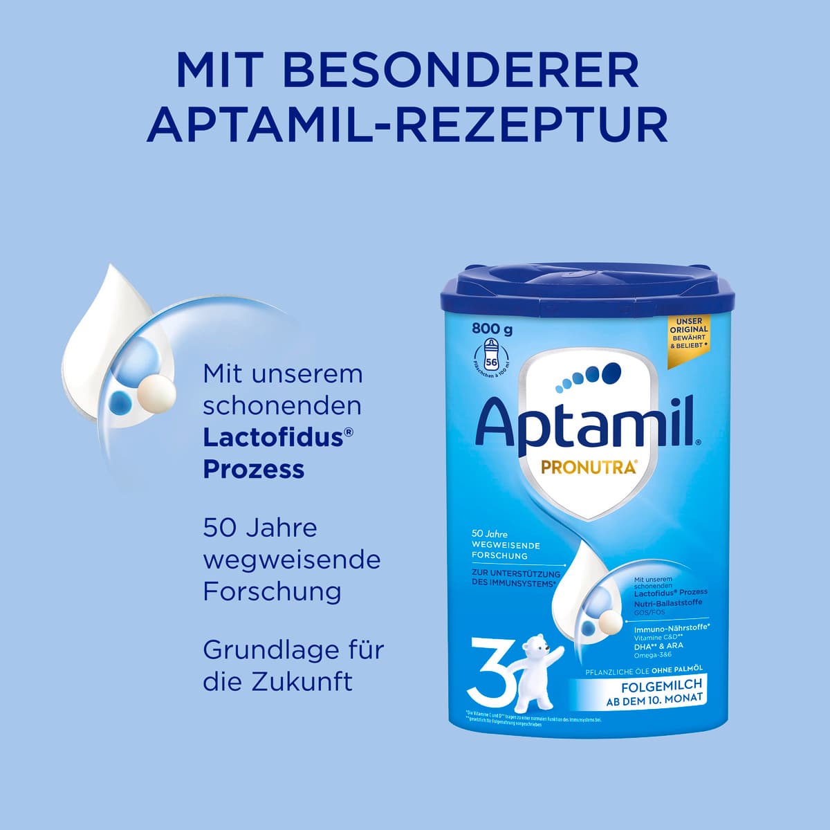 | Anwendungshinweis | Aptamil Pronutra 3 ist für Babys ab dem 10. Monat geeignet und kann im Anschluss an jede andere Folgenahrung gegeben werden. Angebrochene Packung innerhalb von vier Wochen aufbrauchen. |