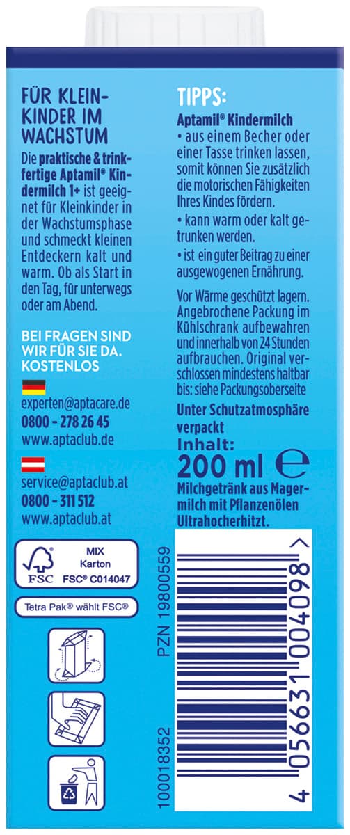 Wichtige Hinweise Aptamil Kindermilch 1+ ist für Kinder ab 1 Jahr geeignet und zum Trinken aus der Tasse oder dem Becher bestimmt. Bitte achten Sie auf eine gründliche Zahnpflege, besonders vor dem Schlafengehen. Bitte achten Sie zudem auf eine abwechslungsreiche und ausgewogene Ernährung sowie eine gesunde Lebensweise. Füllhöhe technisch bedingt. Unter Schutzatmosphäre verpackt.