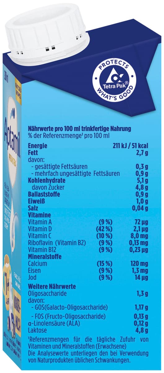| Zutaten | Wasser, MAGERMILCH (31%), Laktose (aus MILCH), Galacto-Oligosaccharide (aus MILCH), pflanzliche Öle (Rapsöl, Sonnenblumenöl) (2,4%), Emulgator (Mono- und Diglyceride aus Speisefettsäuren, Lecithine), Fructo-Oligosaccharide, Calciumorthophosphate, Calciumcitrat, Säureregulator (Kaliumorthophosphate, Citronensäure, Kaliumhydroxid), Calciumcarbonat, FISCHÖL, Calciumhydroxid, natürliches Aroma (enthält MILCH), Vitamin C, Eisenlactat, Stabilisator (Carrageen), Vitamin A, Vitamin B2, Kaliumiodid, Vitamin D, Vitamin B12 |