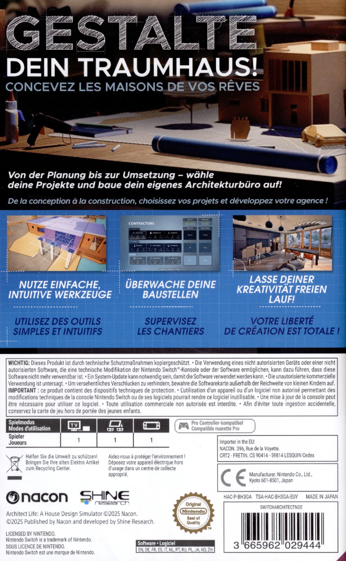 DAS 1. ARCHITEKTUR-SIMULATIONSSPIEL HAUSBAU- UND EINRICHTUNGSBEGEISTERTE KOMMEN AUF IHRE KOSTEN! Entwerfe Traumhäuser! Von der 3D-Planmodellierung bis hin zur Entscheidungsfindung vor Ort musst du jedes Projekt zum Leben erwecken und dabei deiner Kreativität freien Lauf lassen, um dein Architekturbüro auf Top-Niveau zu bringen. Architect Life bietet zwei Hauptspielmodi: den „Karrieremodus“ mit 60 abwechslungsreichen Missionen und den „Freien Modus“, in dem die Spielenden ihre Traumhäuser entwerfen können. Das Team von Shine Research hat großen Wert daraufgelegt, dass sich das Spiel mit einem Gamepad genauso einfach steuern lässt, wie mit Maus und Tastatur. Anhand der vorgegebenen Spezifikationen können die Spielenden das ideale Haus für ihre Kunden entwerfen. Architect Life bietet eine Reihe von intuitiven Werkzeugen, mit denen die Spielenden ihrer Kreativität freien Lauf lassen können, z. B. die Möglichkeit, gerade oder gebogene Wände, mehrstöckige Häuser oder Dächer in beliebiger Form zu bauen. Auch bautechnische Vorschriften werden in das Spiel integriert, um eine gesunde und komfortable Wohnumgebung zu schaffen. Die Spielenden müssen dafür sorgen, dass jeder Raum angemessen beheizt wird und die spezifischen Anforderungen der Kunden für jeden Raum erfüllt werden. Dabei lässt sich sowohl das Äußere als auch das Innere einrichten. Dank eines Farbrads, das eine Vielzahl von Möglichkeiten bietet, steht im Spiel eine große Auswahl an anpassbaren Texturen und Farben zur Verfügung. Sobald die Pläne erstellt sind, ist es an der Zeit, die Subunternehmer auszuwählen und die Fortschritte auf der Baustelle zu überwachen. Angehende Architekt*innen müssen immer bereit sein, sich auf unvorhergesehene Ereignisse während der Bauphase einzustellen, z. B. auf die Widrigkeiten des Wetters, auf Probleme mit den ausgewählten Auftragnehmern und mehr. Es ist wichtig, dass überlegte Entscheidungen getroffen werden, um das Projekt rechtzeitig und im Rahmen des Budgets fertig zu stellen. Mit dem Fortschritt im Karrieremodus können die Spielenden ihr Unternehmen ausbauen, neue Terrains und Boni im Fertigkeitsbaum freischalten. Diese Upgrades gewähren Zugang zu neuen Bautechniken und speziellen Materialien, die für die Bewältigung größerer und komplexerer Architekturprojekte erforderlich sind. Mit der eigenen Kreativität jedes Projekt verwirklichen und das eigene Architekturbüro zum Erfolg führen. • Eine zugängliche Simulation, einfach mit einem Controller zu spielen, mit präzisen Bauwerkzeugen • Ungeheure kreative Freiheit: der Fantasie sind keine Grenzen gesetzt • Das einzige Spiel, in dem Spieler den Plan erstellen, Handwerker auswählen, die Baustelle beobachten und die Innenausstattung fertig stellen FEATURES • Eine umfassende Simulation: Budgetverwaltung, Leistungsverzeichnis, detaillierte Modellierungswerkzeuge und Baustellenüberwachung • Langes Spielvergnügen dank eines Karrieremodus mit 60 Missionen und neuen Fähigkeiten zum Freischalten (grüne Energie, Dämmstoffe, Kostenoptimierung...) • Ein entspannender Freimodus, um das Haus der Träume ohne Einschränkungen zu gestalten • 60 Baugrundstücke in atemberaubenden Berg-, Stadt- und ländlichen Landschaften • Hunderte von Möbeln, Belägen und Materialien, um radikal unterschiedliche Häuser nach den eigenen Wünschen zu gestalten • Erkundung der fertigen Kreationen in der ersten Person Sprachausgabe: keine Bildschirmtext: Französisch, Englisch, Deutsch, Spanisch (Spanien), Japanisch, Polnisch, Portugiesisch (Portugal), Portugiesisch (Brasilien), Russisch, Vereinfachtes Chinesisch, Spanisch (Lateinamerika), Niederländisch