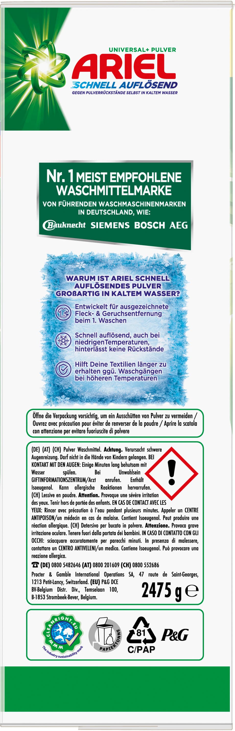 - SCHNELLE, RÜCKSTANDSFREIE AUFLÖSUNG, SELBST BEI NIEDRIGEN TEMPERATUREN: Das Ariel Waschpulver löst sich bei Kontakt mit Wasser schnell auf und hinterlässt keinerlei Rückstände, selbst bei niedrigen Temperaturen