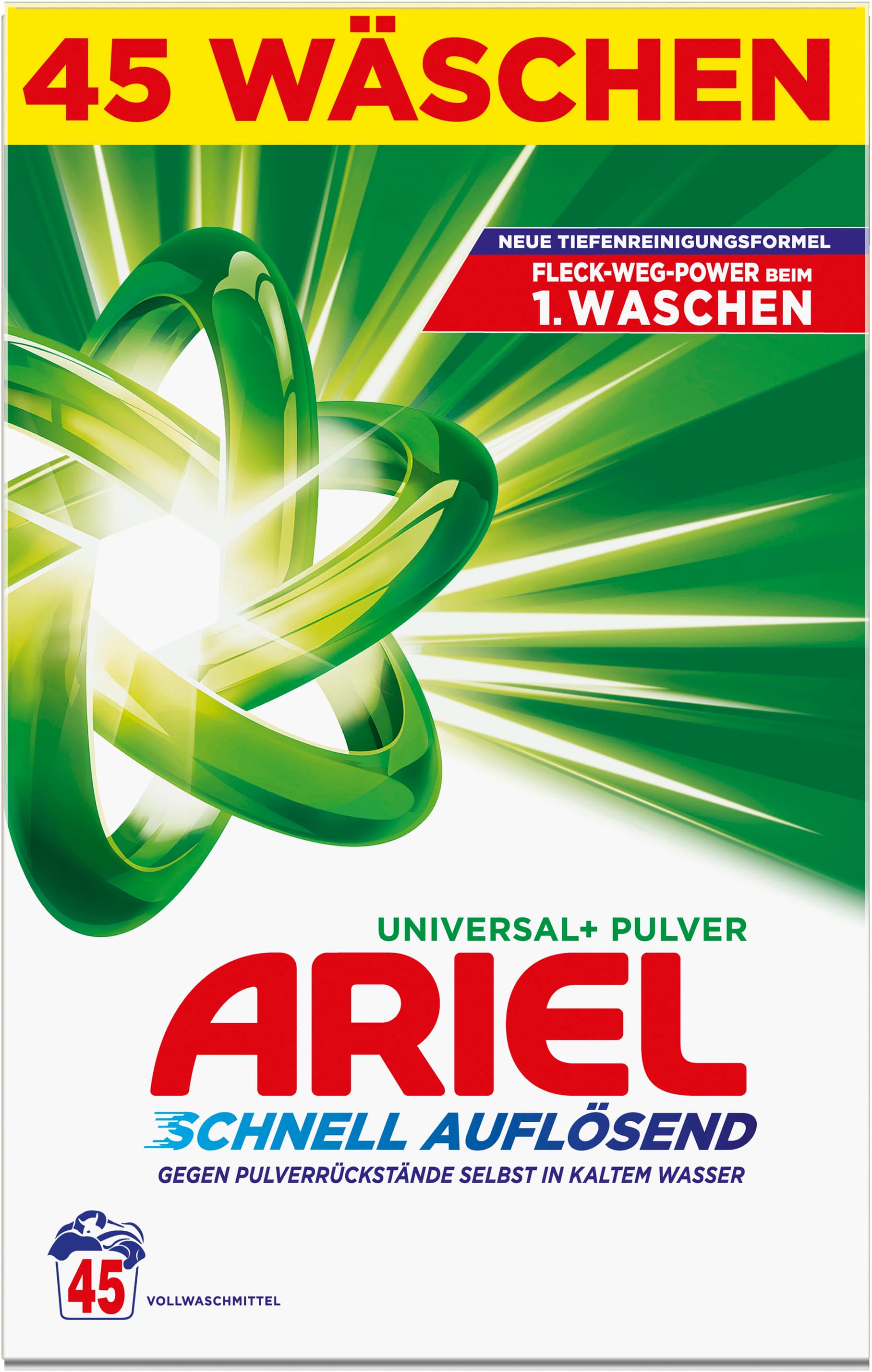 Entdecken Sie Ariel, die Nr. 1 der empfohlenen Marken von führenden Waschmaschinen-Herstellern in Deutschland wie: Bauknecht SIEMENS BOSCH AEG empfehlen Ariel Schnell Auflösendes Universal+ Pulverwaschmittel als Waschmittel. Kraftvolle Fleckenentfernung schon ab der 1. Waschladung. Darüber hinaus ist es so konzipiert, dass es sich dank seiner einzigartigen Anti-Rückstands-Technologie auch bei Kaltwasserzyklen optimal und schnell auflöst, ohne Rückstände zu hinterlassen. Es bietet außerdem kraftvolle Flecken- und Geruchsentfernung schon ab der 1. Waschladung. Durch Waschen bei niedrigen Temperaturen schützen Sie Ihre Wäsche im Vergleich zu Waschprogrammen bei höherer Temperatur. Das Ariel Pulverwaschmittel - für strahlende Reinheit und angenehmen Duft.