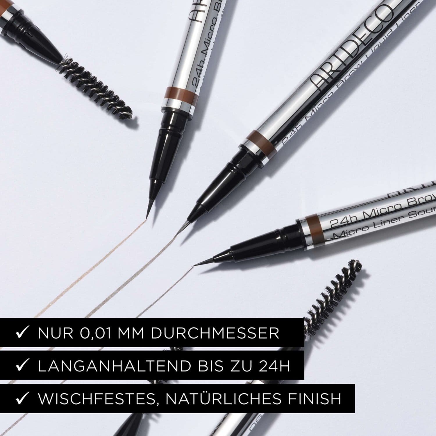 Shape and define! Mit dem micro-feinen 24h Micro Brow Liquid Liner von ARTDECO kannst Du Deine Augenbrauen perfekt formen und definieren. Dank der ultrafeinen, flexiblen Spitze mit nur 0,01 mm Durchmesser ist ein präziser Auftrag möglich. Ob feine oder dicke Linien – mit diesem Liner kannst Du Deine natürlichen Härchen imitieren. Zeichne Dir naturgetreue, feine Brauen-Härchen an den Stellen, an denen Du Deine Augenbrauen auffüllen möchtest. Das Resultat: Ein natürliches und perfektes Finish! Dank der speziellen Fließtechnologie ist der schnelltrocknende Stift mit einem exzellenten Farbfluss ausgestattet und ermöglicht so eine ebenmäßige Farbabgabe. Zusätzlich besitzt der 24h Micro Brow Liquid Liner einen integrierten Bürstchen-Aufsatz, mit dem Du Deine Brauen nach Belieben in Form bringen kannst.