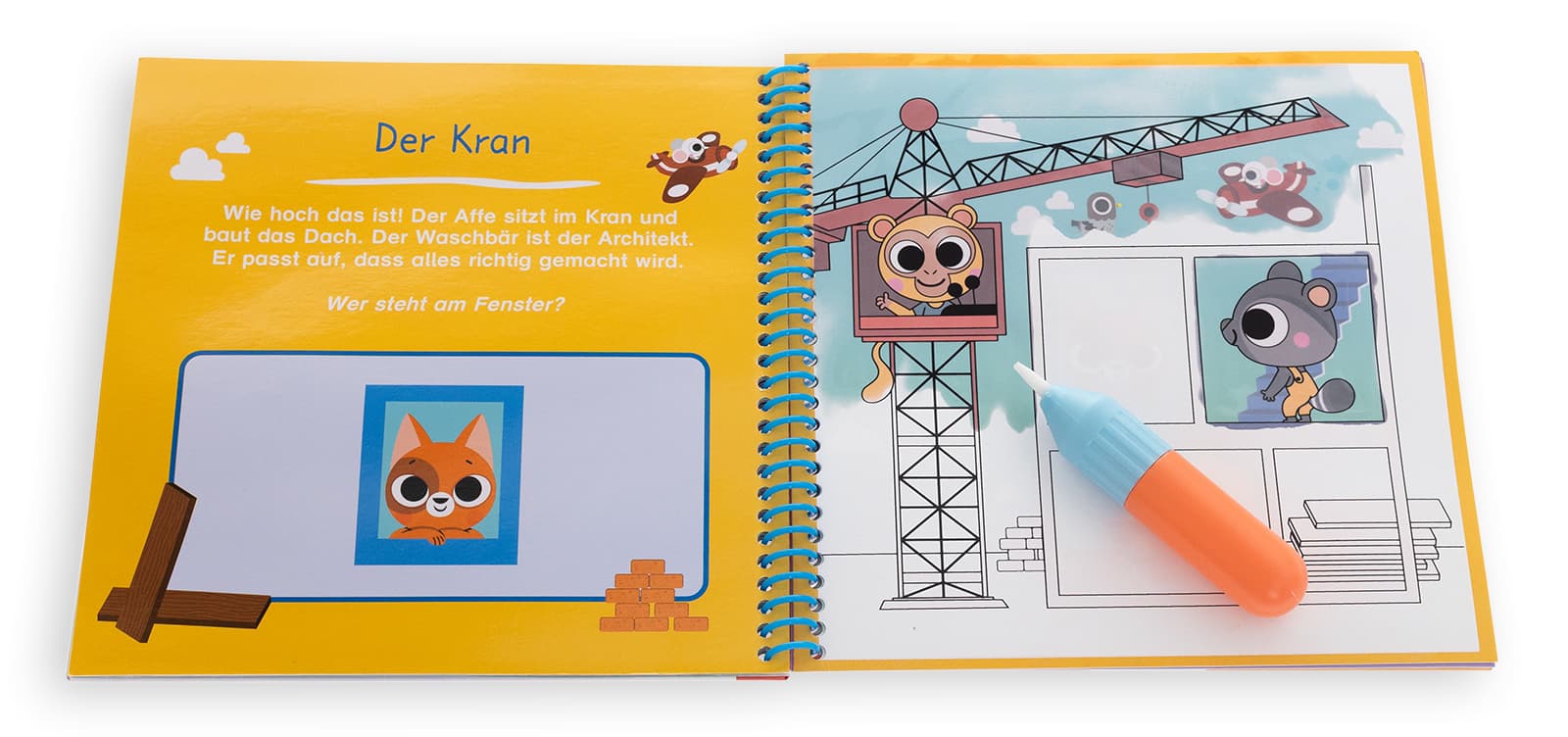 In diesem Malbuch mit Wassertankpinsel laden lustige Baustellen-Szenen Kinder ab 3 Jahren dazu ein, die Bilder zum Leuchten zu bringen. Einfach den Zauberpinsel mit Wasser befüllen und dann über das Bild streichen – schon erscheinen Bagger, Kran und Co. in bunten Farben.