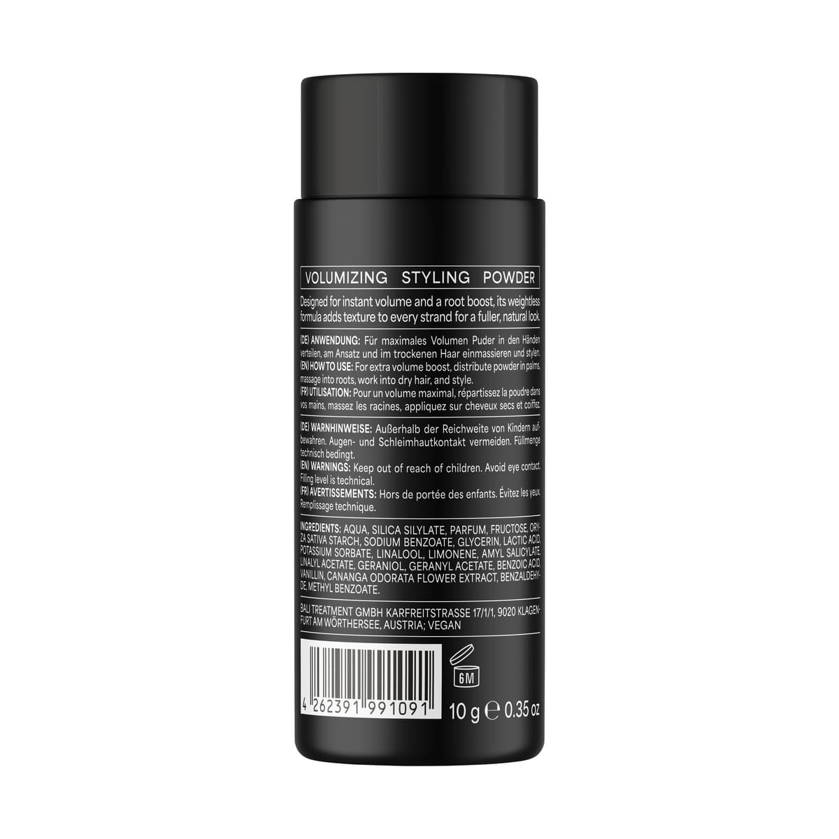 | Anwendungshinweis | Eine kleine Menge des Puders in den Handflächen verreiben oder direkt auf den Haaransatz streuen. In das trockene Haar einmassieren und nach Belieben stylen. |