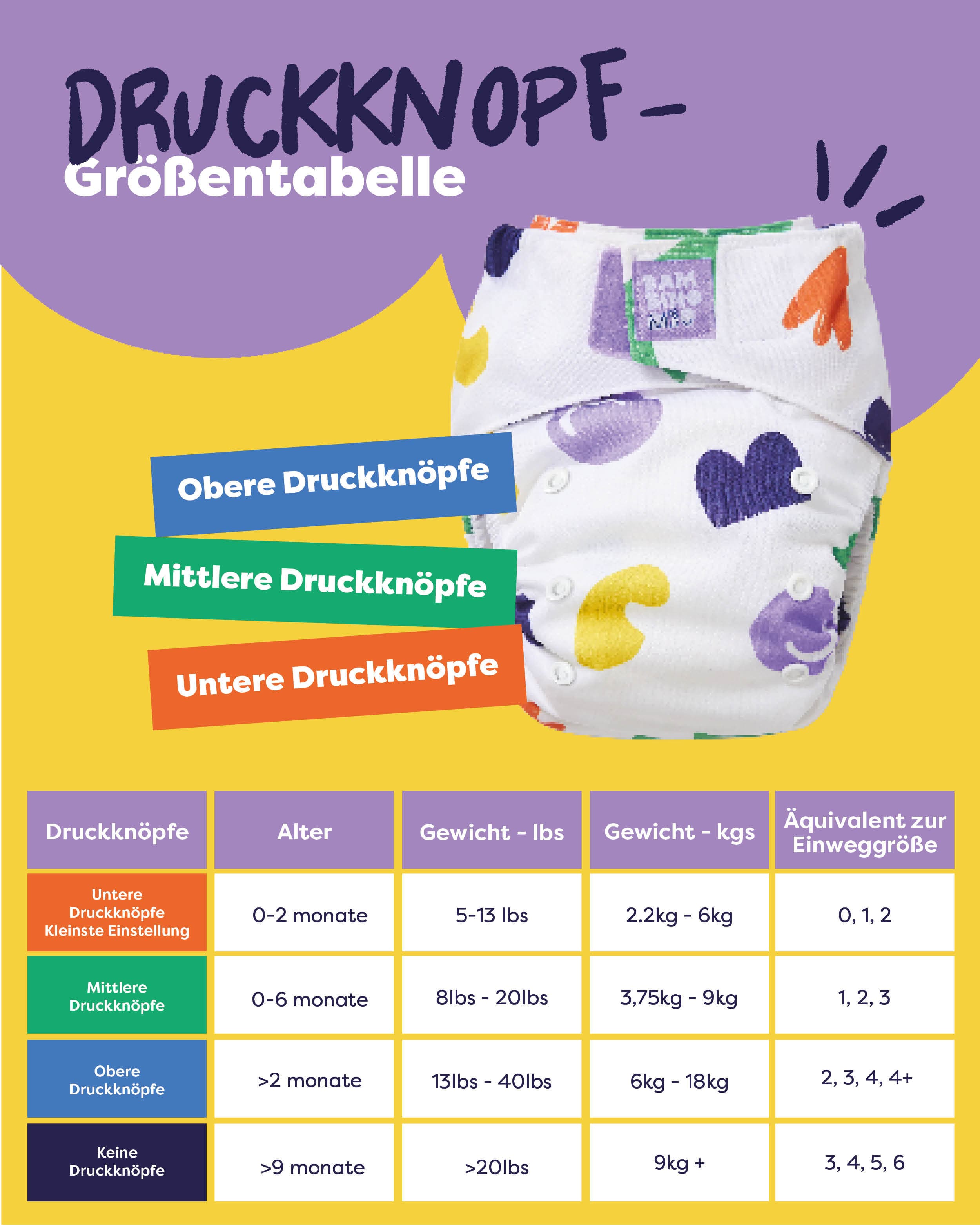 Wie verwende ich die Druckknöpfe? Stelle die Druckknöpfe vor jedem Wickeln richtig ein– es ist viel einfacher, wenn du kein zappelndes Baby in der Windel hast. Wenn du ein Neugeborenes hast, musst du die unteren Druckknöpfe verwenden und sie an den oberen Gegenstücken befestigen. Wenn dein Kind ein Kleinkind ist, wirst du die Druckknöpfe wahrscheinlich gar nicht mehr brauchen, sondern mit den verstellbaren Klettverschlüssen an der Vorderseite die Passform anpassen, wenn sich die Statur des Kindes verändert.