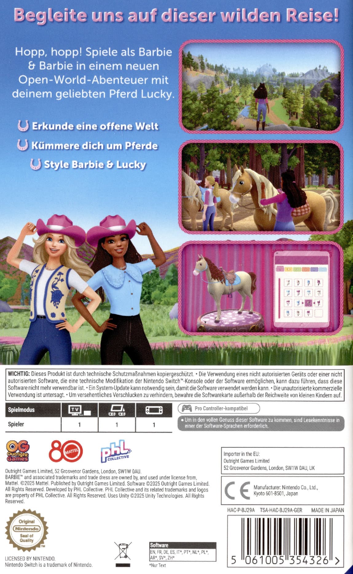 Auf in den Sattel! Als Barbie und Barbie geht es in einem neuen Open-World-Abenteuer durch den Canterbury Trails Park mit deinem Lieblingspferd Lucky. Kens Tante, Lady Carson, und die Park-Ranger helfen dir dabei, den Park noch schöner zu machen und ihn in einen Ort zu verwandeln, an dem sich alle wohlfühlen! Wildblumenwiesen laden zum Galoppieren ein, üppige Wälder zum Erkunden, atemberaubende Berge zum Klettern und ein glitzernder See zum Entspannen. In den gemütlichen Hütten und auf dem belebten Campingplatz warten Freunde wie Ken, Teresa, Nikki und Daisy mit lustigen Nebenmissionen auf dich und im Wildtierzentrum gibt es faszinierende Tiere und Pflanzen zu entdecken. Lucky benötigt ganz viel Pflege, denn wenn sie geputzt, gestriegelt und gefüttert wird, entsteht eine starke Beziehung zwischen euch. Alle wichtigen Infos über den Park erhältst du als Junior-Ranger:in in Ausbildung von Chefrangerin Annalise. Gemeinsam mit der Archäologin Dr. Potts geht es auf die Suche nach Keramiken und einem geheimnisvollen Pferd. Ein Ritt durch die Wildnis bietet unglaubliche Fotogelegenheiten, die in deinem Tagebuch aufbewahrt werden können, um die Schönheit des Parks festzuhalten. Auf deinen Abenteuern gibt es viele Truhen mit Sammlerstücken und beim Styling von Barbie und Barbie ist Kreativität gefragt, damit jedes Abenteuer zu einem besonderen Erlebnis wird. Lucky kann mit Zaumzeug, Sattel, bunten Zöpfen, Bändern und Haarspangen herausgeputzt werden. In diesem Spiel gibt es viel zu entdecken und freizuschalten. Ein spannendes Reitabenteuer winkt! FEATURES • PFERDEPFLEGE: Durch die Pflege deines Pferdes Lucky wird es eine unvergessliche Beziehung zu dir aufbauen. • ALS BARBIE SPIELEN: Spielbare Charaktere - Barbie "Brooklyn" Roberts oder Barbie "Malibu" Roberts. • EINE OFFENE WELT: Lucky will spazieren gehen, traben oder galoppieren, um die Schönheit des Parks zu entdecken. • JUNIOR-RANGER-TRAINING: Der Canterbury Trails Park ist auf deine Hilfe und die von Naturexperten angewiesen. • WILDTIERE FOTOGRAFIEREN: Die Kamera ist immer griffbereit, um Tiere, Pflanzen und andere Funde zu fotografieren und in deinem Tagebuch festzuhalten, was auch bei der Erfüllung deiner Aufgaben hilft. Sprachen: Deutsch, Englisch, Französisch, Spanisch Untertitel: Deutsch, Englisch, Französisch, Italienisch, Spanisch, Brasilianisches Portugiesisch, Niederländisch, Polnisch, Schwedisch, Arabisch und Traditionelles Chinesisch