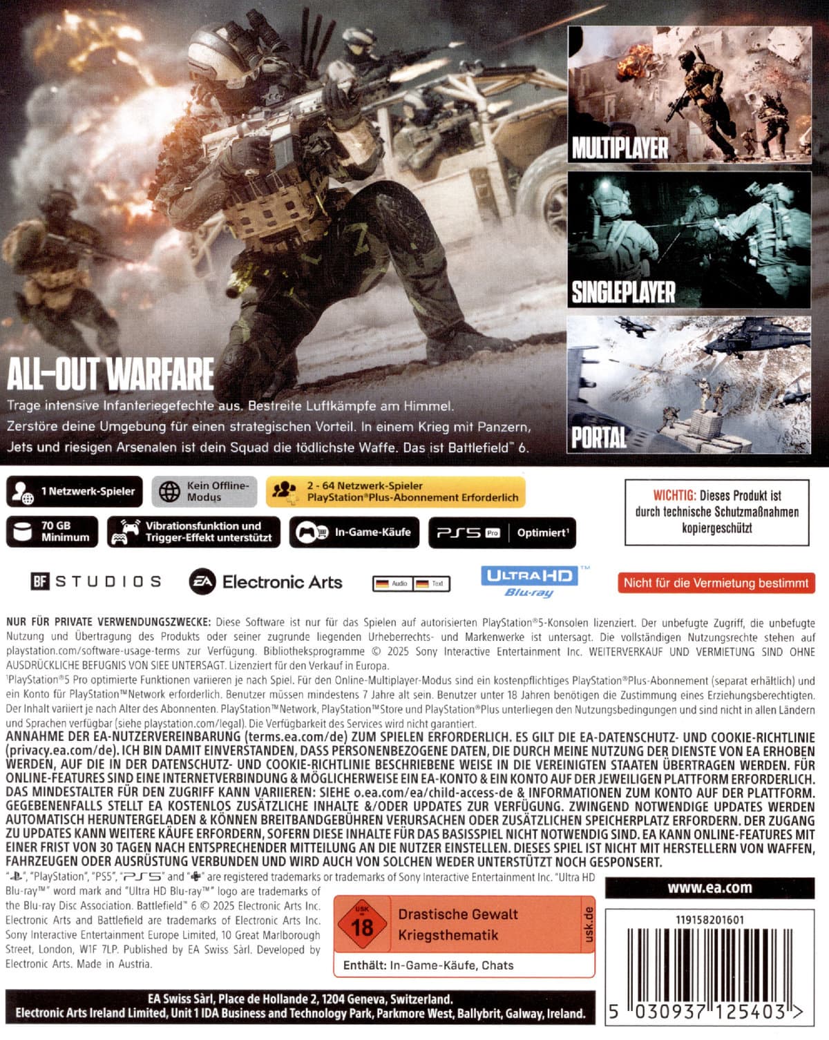 Das ultimative All-Out Warfare-Erlebnis. Trage intensive Infanteriegefechte aus. Beherrsche den Himmel in Luftkämpfen. Zerstöre deine Umgebung für einen strategischen Vorteil. Kontrolliere jede Aktion und Bewegung mit dem Kinästhetik-Kampfsystem. In einem Krieg mit Panzern, Jets und riesigen Arsenalen ist dein Squad die tödlichste Waffe. Das ist Battlefield 6. DER NEUE STANDARD FÜR FPS-KÄMPFE Das neue Kinästhetik-Kampfsystem von Battlefield verbindet dich enger mit deinem Soldaten und deiner Umgebung als je zuvor. Mit überarbeiteten Feuergefechten und taktischen Bewegungen vom geduckten Sprinten bis zum Wegziehen und Wiederbeleben sind jeder Schuss und jede Bewegung instinktiver und präziser. MEHR WEGE IN DIE SCHLACHT Sieg, wie auch immer du ihn dir vorstellst. In Battlefield 6 gibt es mehr Wege zum Sieg denn je. Strebe nach Ruhm in legendären Modi wie Eroberung, Durchbruch und Rush. Stürze dich in die rasante Action von King of the Hill und Vorherrschaft. Ändere die Regeln des Krieges mit dem überarbeiteten Battlefield Portal. Kämpfe in Kairo, Brooklyn, Gibraltar und an anderen ikonischen Schauplätzen in aller Welt. IKONISCHER ALL-OUT WARFARE Erlebe All-Out War mit Infanterie- und Fahrzeuggefechten, klassenbasiertem Squad-Spiel und modernster audiovisueller Immersion. Kampfjets, Panzer, Fallschirmjäger, schwere Artillerie und intensive Infanteriegefechte werden zu einem großen Ganzen. Diesen Krieg gibt es nur bei Battlefield. GLOBALE KAMPAGNE Die Kampagne kehrt zurück. Fahre mit Panzern durch die Sahara. Stürme die Strände von Gibraltar. Verteidige New York gegen eine Invasion. Schließe dich einem Elitesquad aus Marine Raiders an und kämpfe unermüdlich, um eine Welt am Rande des Kollaps zu retten. TAKTISCHE ZERSTÖRUNG Zerstörung ist deine Waffe. Verwandle ein Fahrzeug in eine Abrissbirne. Begrabe einen Squad unter einem Gebäude. Zerstöre deine Umgebung, um einen strategischen Vorteil zu erlangen. Reaktiver und präziser denn je. Dank audiovisueller Hinweise weißt du genau, wie kurz ein Objekt vor der Zerstörung steht. Meistere deine Umgebung. Verschaffe deinem Squad einen Vorteil. PORTAL Definiere den Kampf neu. Battlefield Portal ist eine riesige Sandbox, in der Ersteller und Spielende Battlefield an seine Grenzen bringen können. Kontrolliere deine Umgebung mehr denn je, indem du Objekte bewegst, skalierst und duplizierst. Erstelle einen einzigartigen Spielmodus mit NPC-Scripting und einer individualisierbaren Oberfläche. Deine Kreation kann sogar aufsteigen und ein offizieller Battlefield-Modus werden. Zeig ihnen, was du kannst. Erfordert Internet, kein Offline-Modus! Spiel komplett in Deutsch!