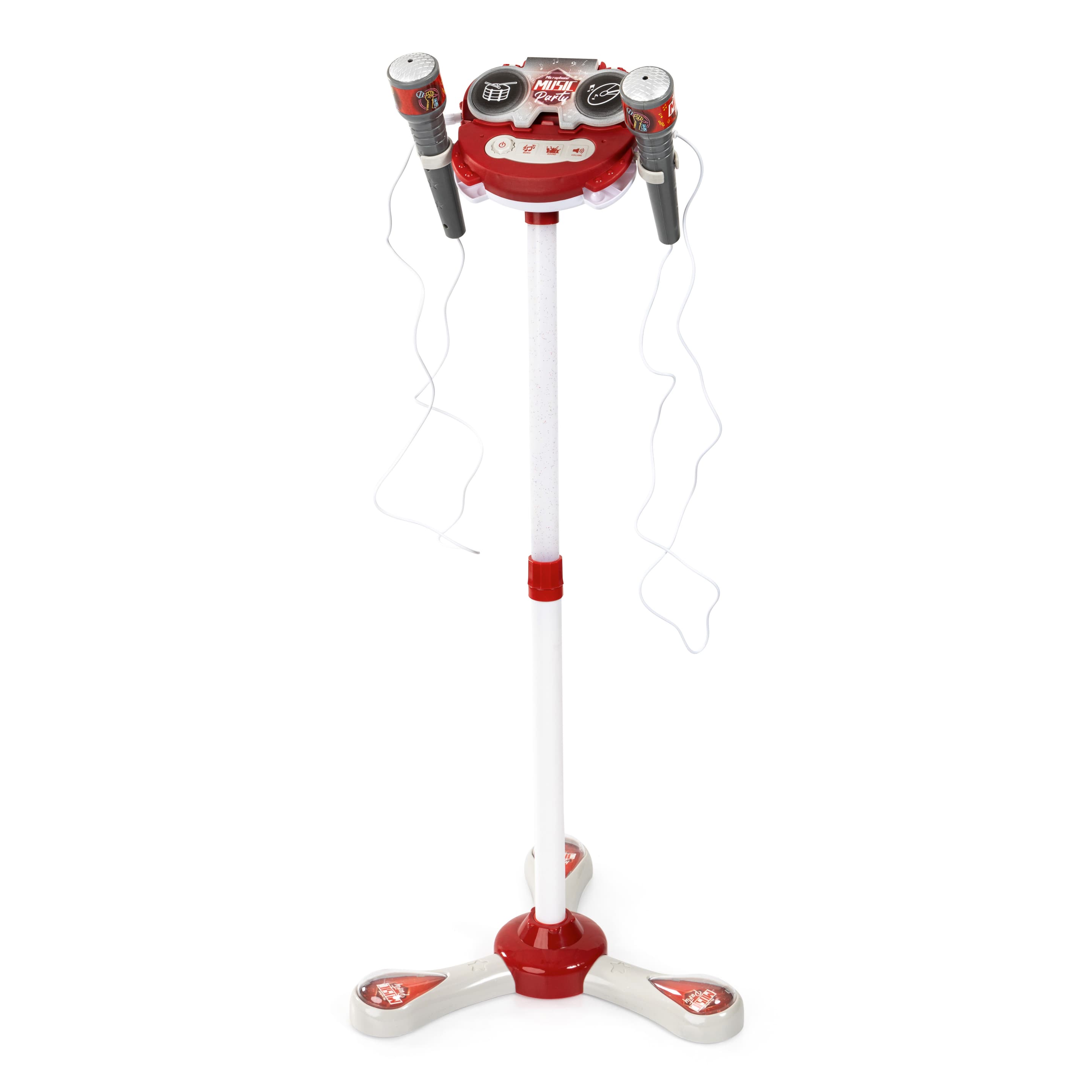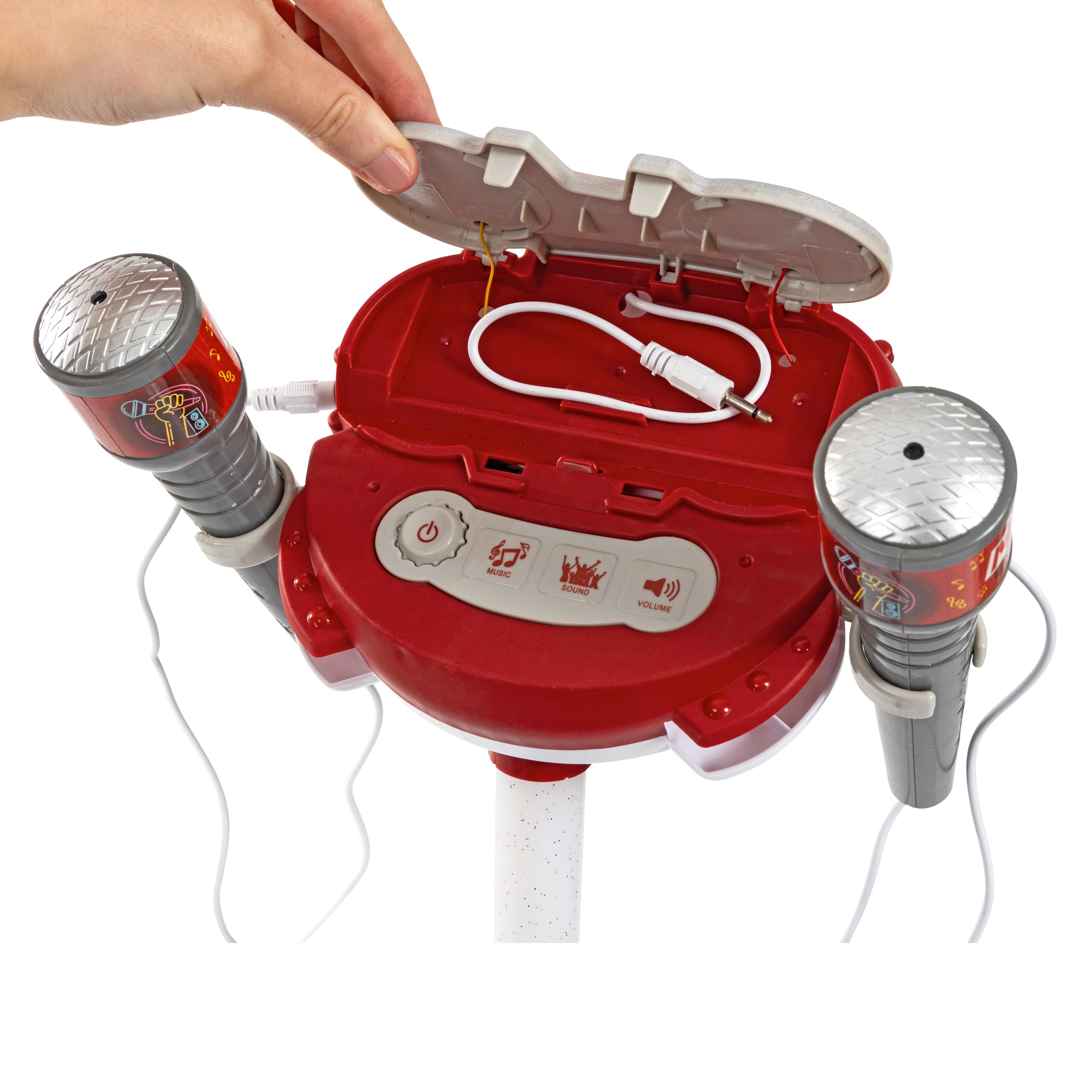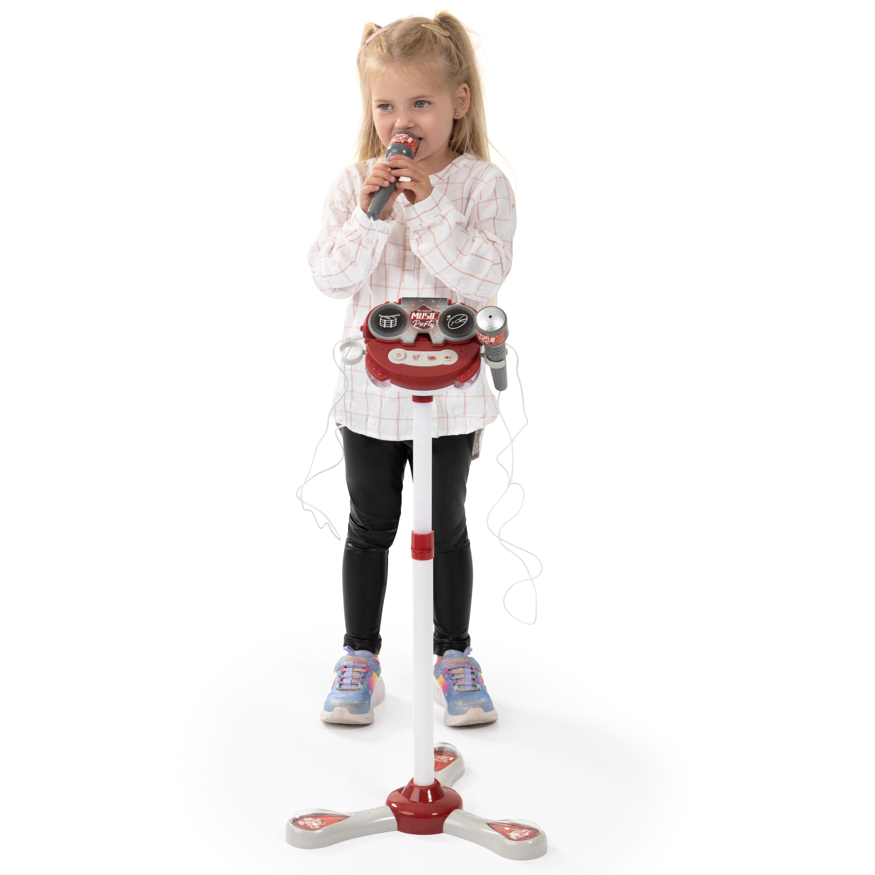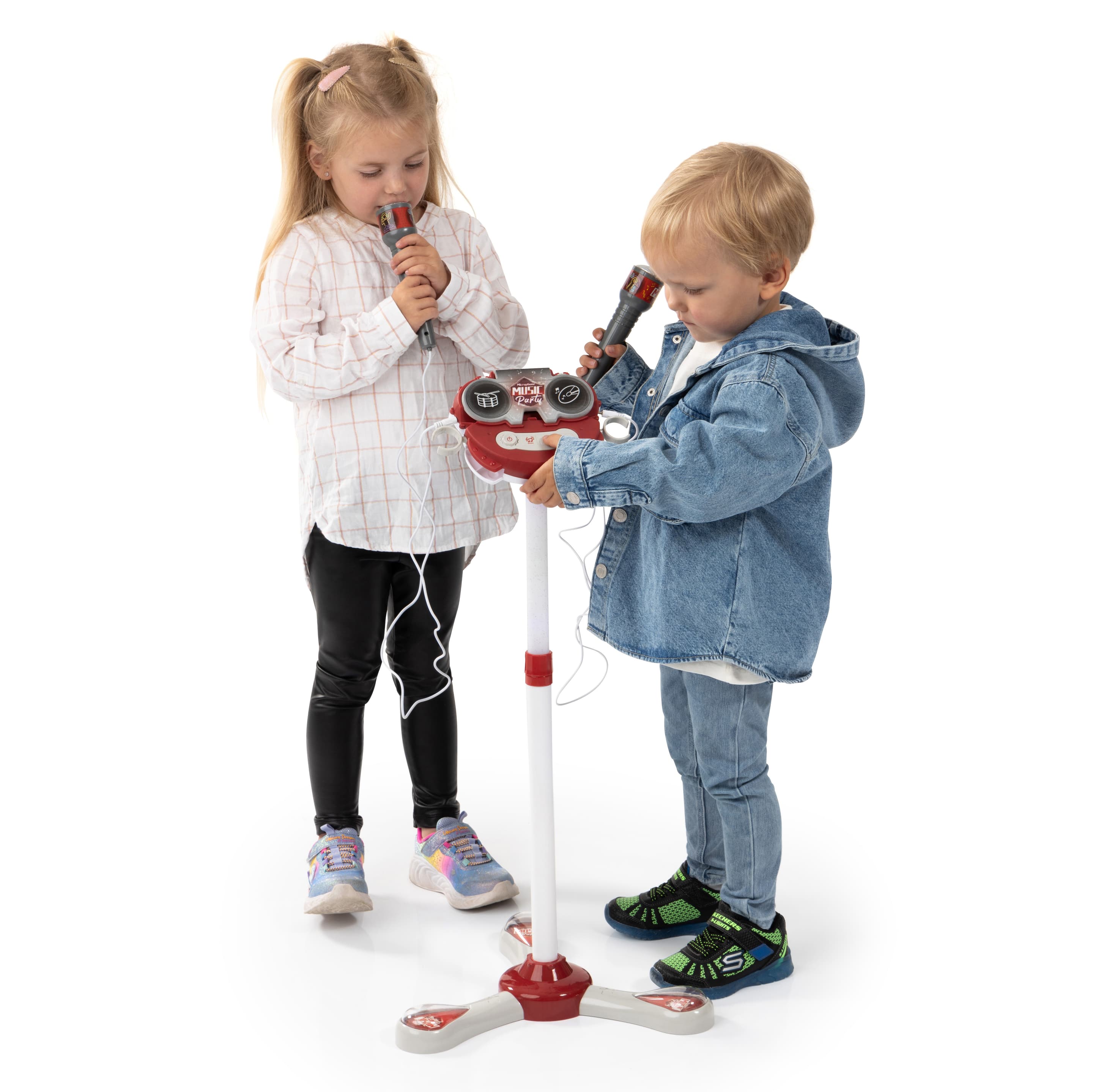 Dieses aufregende Kinder-Karaoke-Set bietet zwei Mikrofone sowie beeindruckende Licht- und Soundeffekte. Perfekt für kleine Musikbegeisterte Kinder, die gleichzeitig singen und tanzen wollen. Spielen Sie Musik direkt von Ihrem Smartphone ab und lassen Sie die Kinder dazu performen. Das Set beinhaltet ein Verbindungskabel (3,5 mm Klinke) für eine einfache Verbindung. Der Steuertisch unterstützt Smartphones und verfügt über Effekttasten für Kickdrums, Becken, Applaus und Demomusik. Damit können die Kinder ihrer Performance eine besondere Note verleihen und das Publikum begeistern. Der Ständer ist höhenverstellbar und mit einem 3-Fuß-Untergestell ausgestattet, um den unterschiedlichen Bedürfnissen der Kinder gerecht zu werden und für sicheren Halt zu sorgen. Dieses Kinder-Karaoke-Set bietet alles, was junge Talente für eine großartige Show brauchen! Perfekt für Geburtstage, Partys und jeden Tag, an dem Musik im Mittelpunkt steht.
