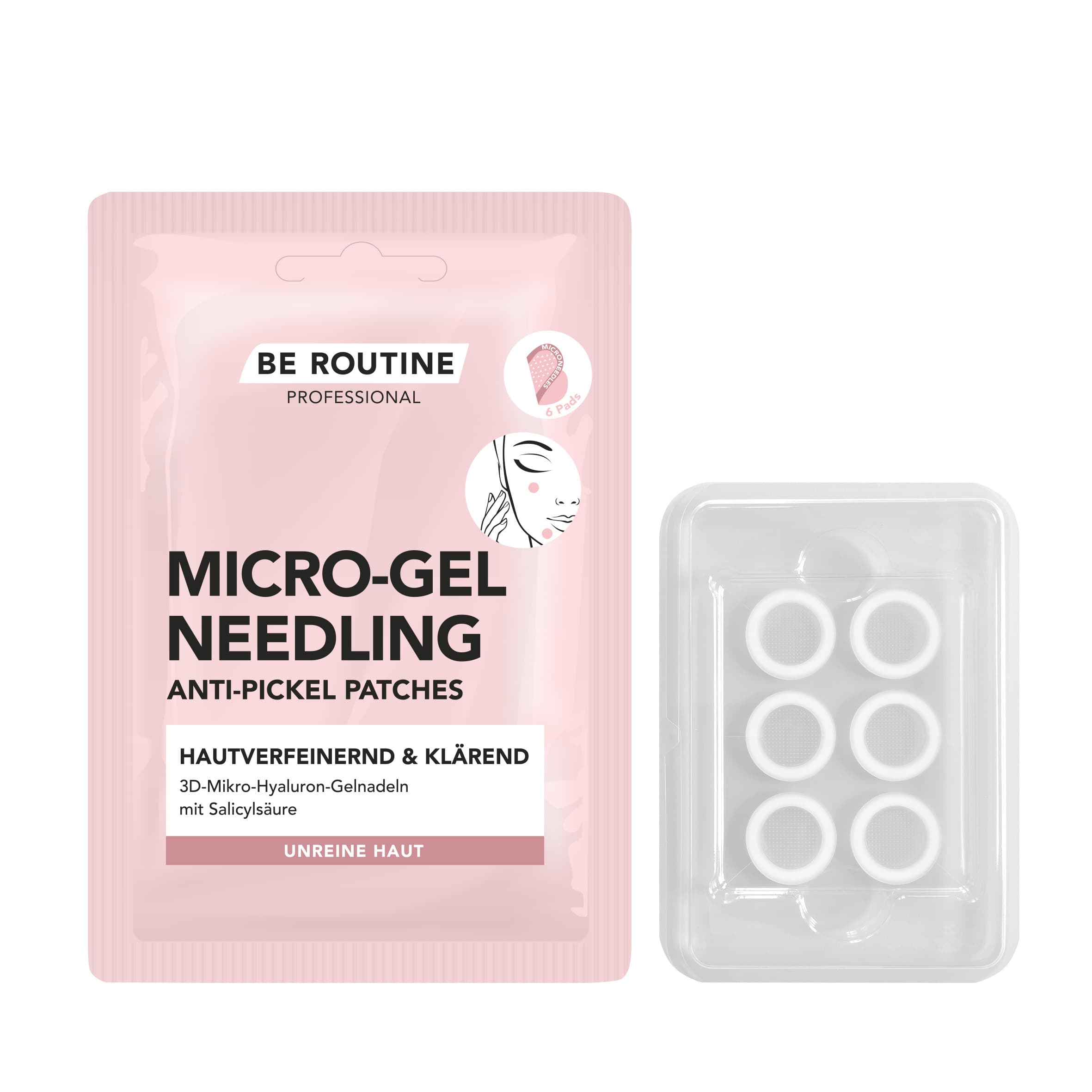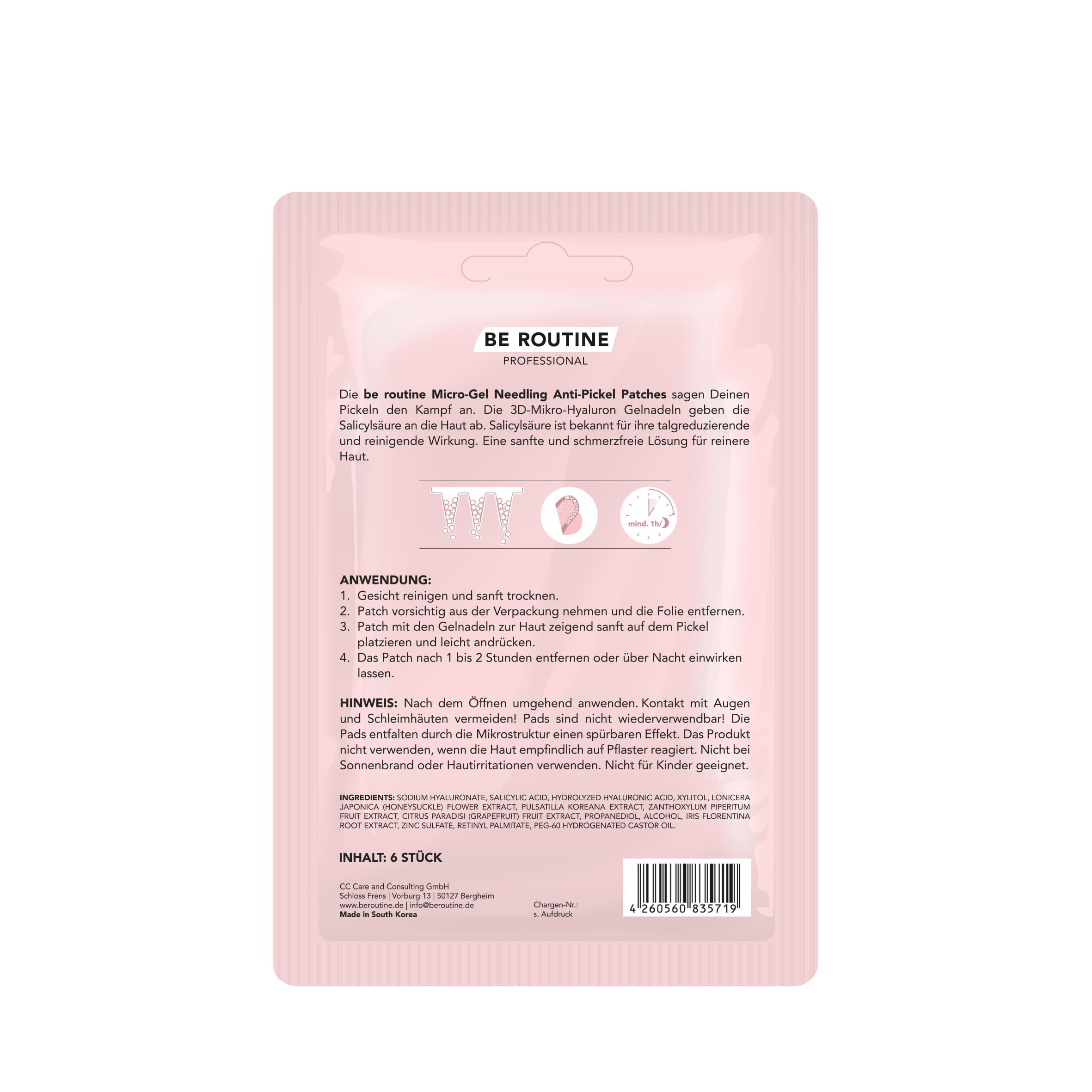 Die Micro-Gel Needling Anti-Pickel Patches von be routine wurden für die gezielte Anwendung auf unreiner Haut konzipiert. Sie kombinieren 3D-Mikro-Hyaluron-Gelnadeln mit Salicylsäure.