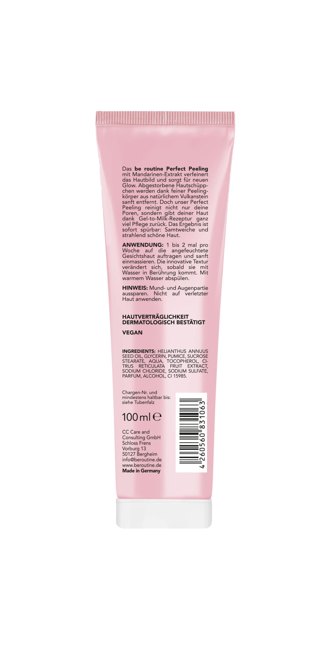 Das Perfect Peeling von be routine mit Mandarinen-Extrakt und feinen Peelingkörpern aus natürlichem Vulkanstein reinigt die Haut und verleiht ein strahlendes Aussehen. Die Gel-zu-Milch-Formel sorgt für ein angenehmes Hautgefühl während der Anwendung.