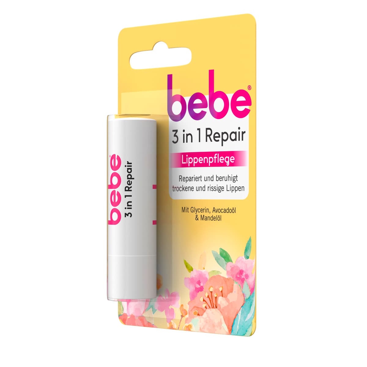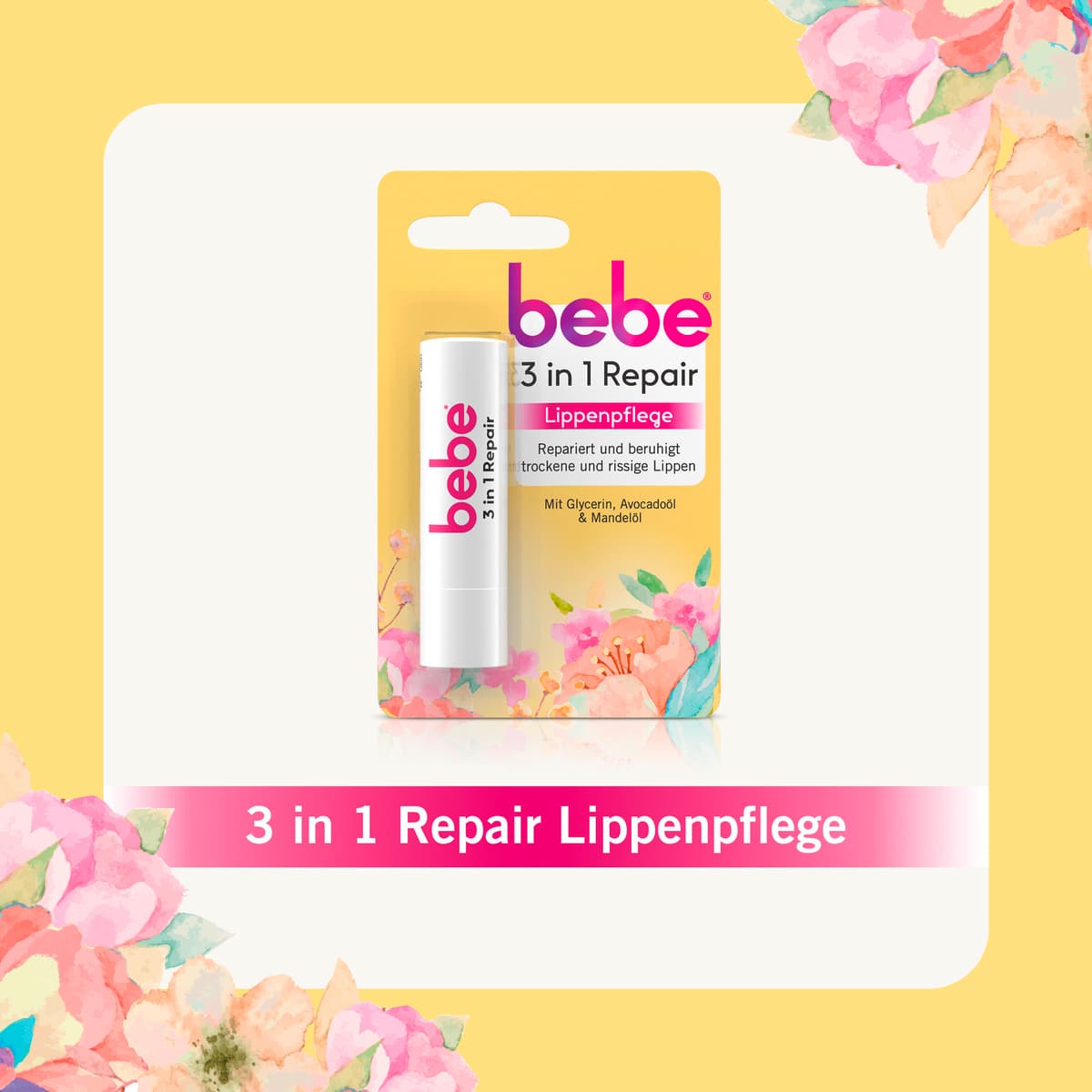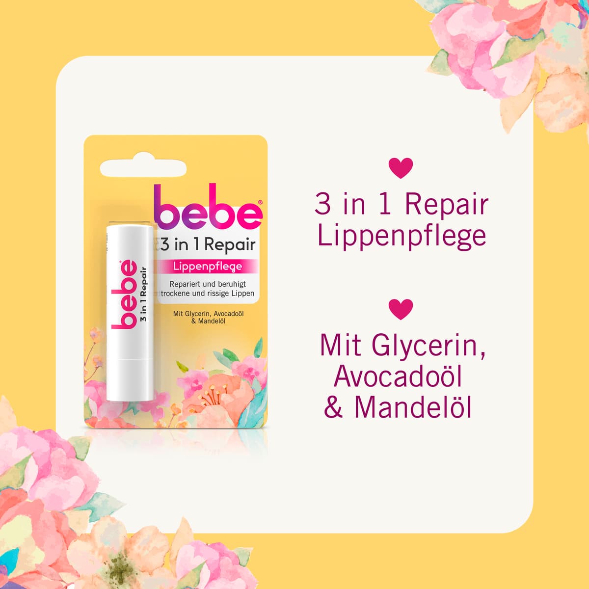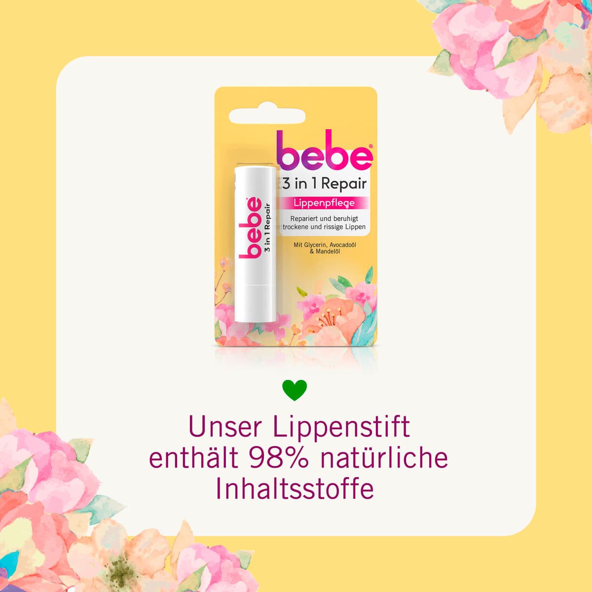 - Inhaltsstoffe natürlichen Ursprungs – Die bebe 3in1 Repair Lippenpflege pflegt trockene Lippen intensiv mit Inhaltsstoffen natürlichen Ursprungs und schützt sie vor dem Austrocknen.