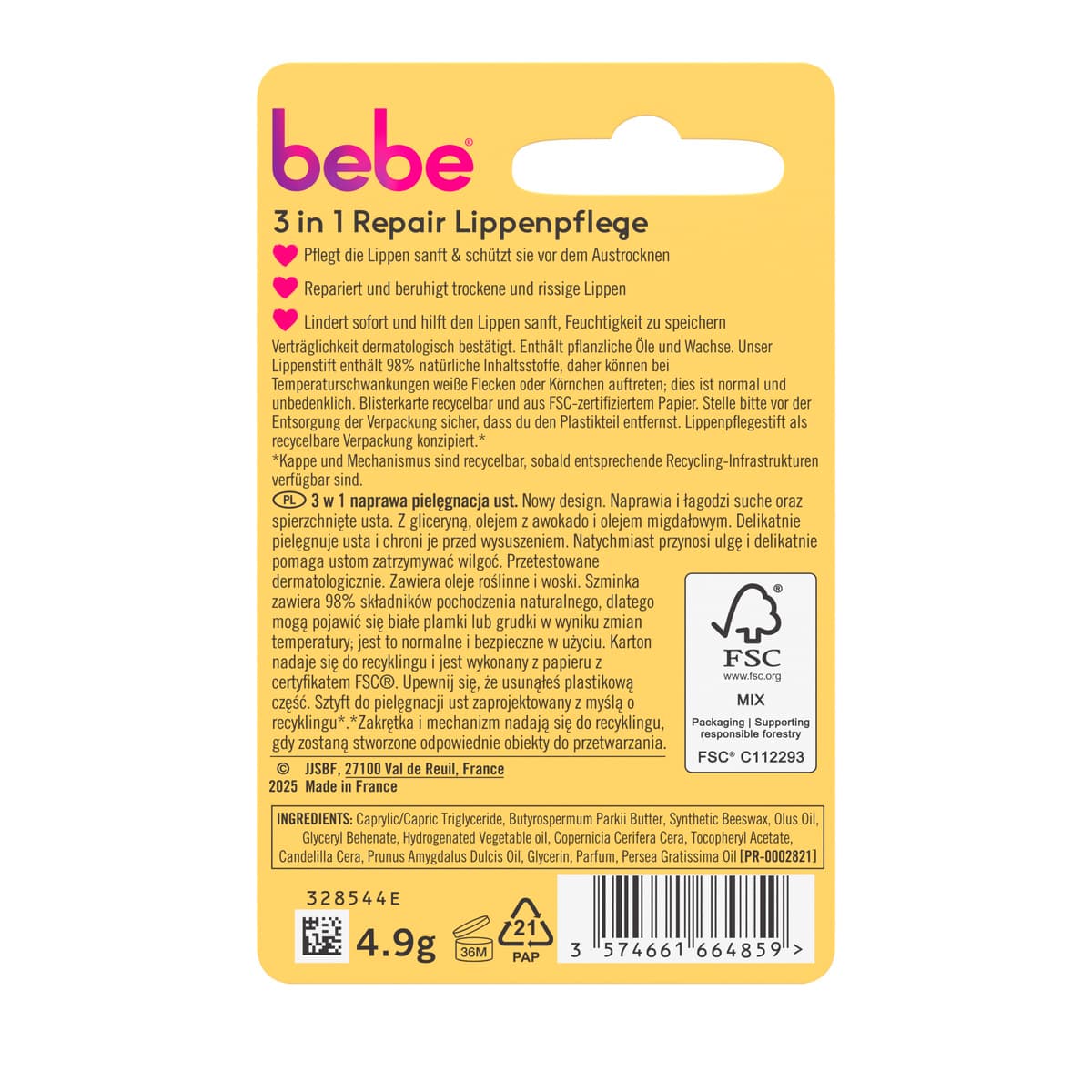 Unsere bebe 3in1 Repair Lippenpflege mit Glycerin, Avocadoöl & Mandelöl repariert trockene und rissige Lippen und beruhigt sie ab der ersten Anwendung. Mit Inhaltsstoffen natürlichen Ursprungs pflegt die Formel die Lippen intensiv und schützt sie vor dem Austrocknen. Zudem ist die Lippenpflege frei von Mineralölen und formuliert, um Allergierisken zu minimieren. Die Blisterkarte ist recycelbar und aus FSC-zertifiziertem Papier. Das Ergebnis? 100% Du. bebe. be you. be true.