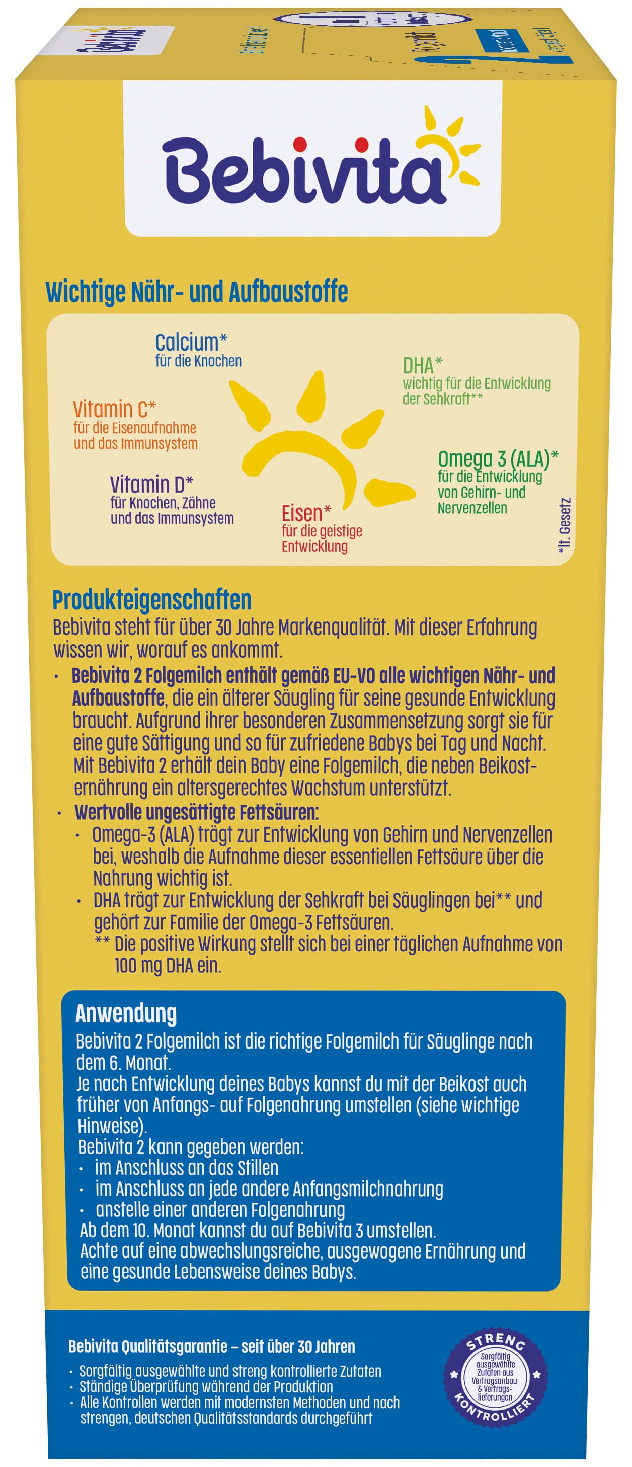 Unsere Bebivita 2 Folgemilch ist ideal nach dem 6. Monat als Ergänzung zur Beikost. Sie ist altersgerecht sättigend und enthält alle wichtigen Nähr- und Aufbaustoffe, die dein Baby für seine gesunde Entwicklung braucht. Die Bebivita Folgemilch enthält neben Omega-3 (ALA) für die Entwicklung von Gehirn- und Nervenzellen auch DHA für die Entwicklung der Sehkraft sowie Vitamin C und D für das Immunsystem. Unsere Milchnahrungen werden in Deutschland hergestellt und sind streng kontrolliert - das garantiert unsere Markenqualität seit über 30 Jahren.