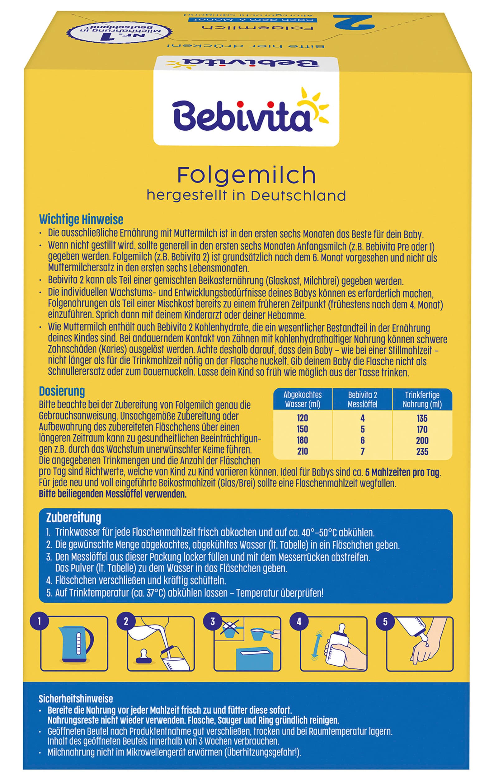 Wichtige Hinweise: • Die ausschließliche Ernährung mit Muttermilch ist in den ersten sechs Monaten das Beste für Ihr Baby. • Wenn nicht gestillt wird, sollte generell in den ersten sechs Monaten Anfangsmilch (z.B. Bebivita Pre oder 1) gegeben werden. Folgemilch (z.B. Bebivita 2) ist grundsätzlich nach dem 6. Monat vorgesehen und nicht als Muttermilchersatz in den ersten sechs Lebensmonaten. • Bebivita 2 kann als Teil einer gemischten Beikosternährung (Glaskost, Milchbrei) gegeben werden. • Die individuellen Wachstums- und Entwicklungsbedürfnisse Ihres Babys können es erforderlich machen, Folgenahrungen als Teil einer Mischkost bereits zu einem früheren Zeitpunkt (frühestens nach dem 4. Monat) einzuführen. Sprechen Sie dann mit Ihrem Kinderarzt oder Ihrer Hebamme. • Wie Muttermilch enthält auch Bebivita 2 Kohlenhydrate, die ein wesentlicher Bestandteil in der Ernährung Ihres Kindes sind. Bei andauerndem Kontakt von Zähnen mit kohlenhydrathaltiger Nahrung können schwere Zahnschäden (Kari