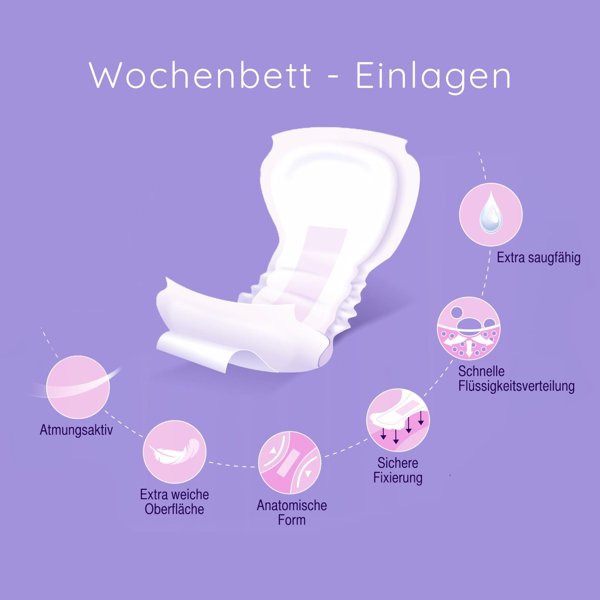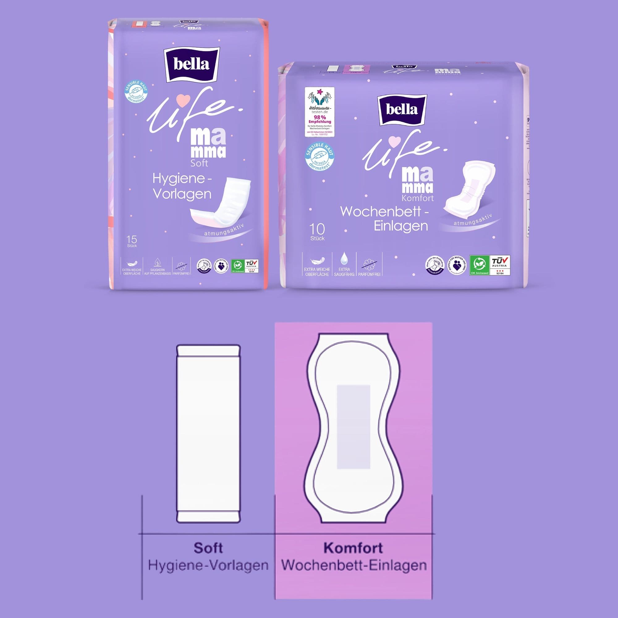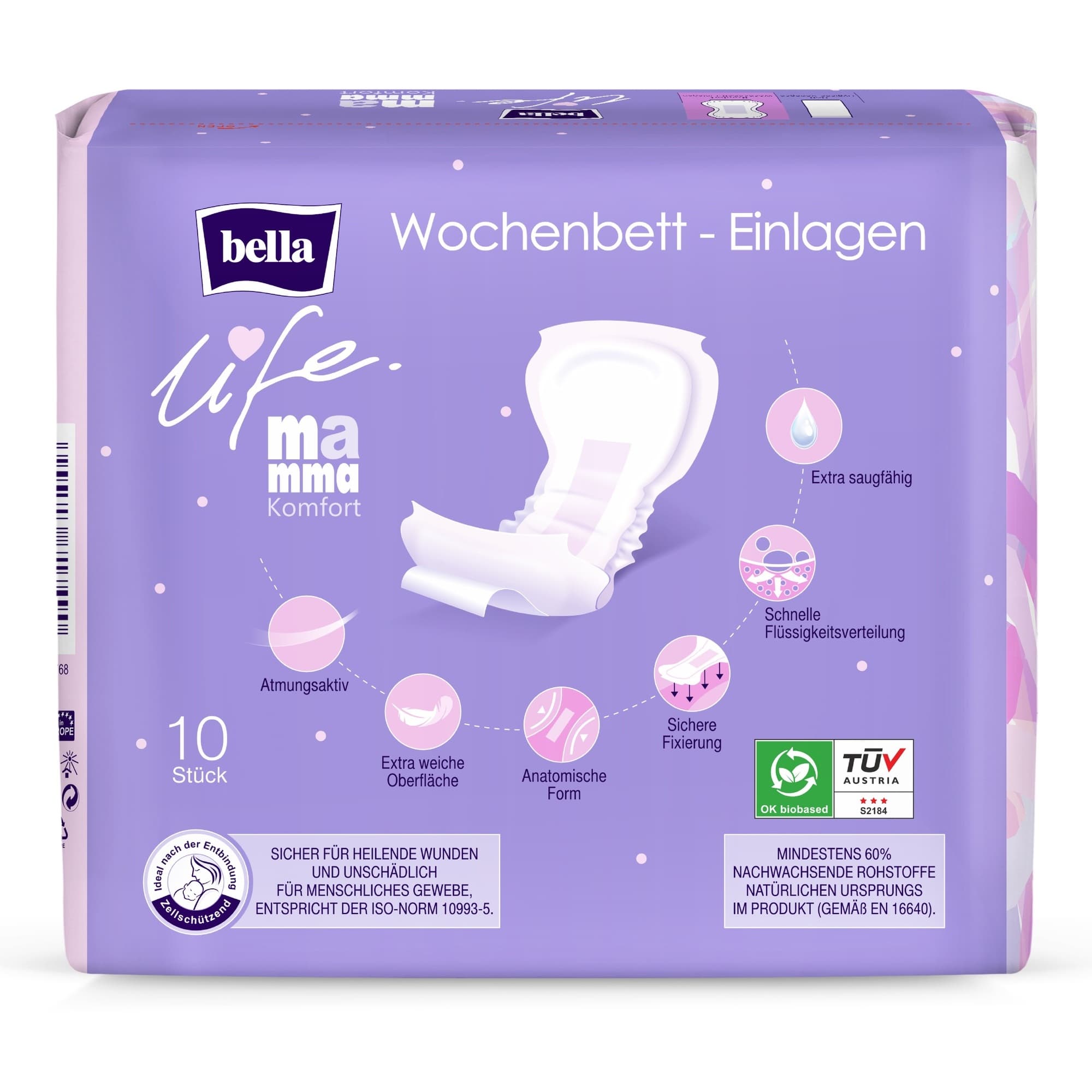 bella life mamma Komfort Wochenbett-Einlagen sind anatomisch geformt, atmungsaktiv und bestehen aus weichen, hochsaugfähigen Zellstoff-Flocken. Der Superabsorber dieser Einlagen nimmt die Flüssigkeit schnell und vollständig auf. Weiche und zarte Oberfläche schützt vor Hautreizungen und garantiert einen optimalen Tragekomfort. Besonders empfohlen für Frauen bei stärkeren Blutungen im Wochenbett und nach gynäkologischen Eingriffen.