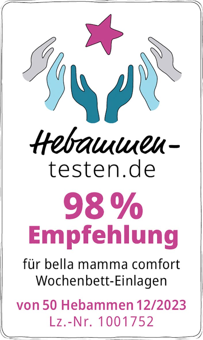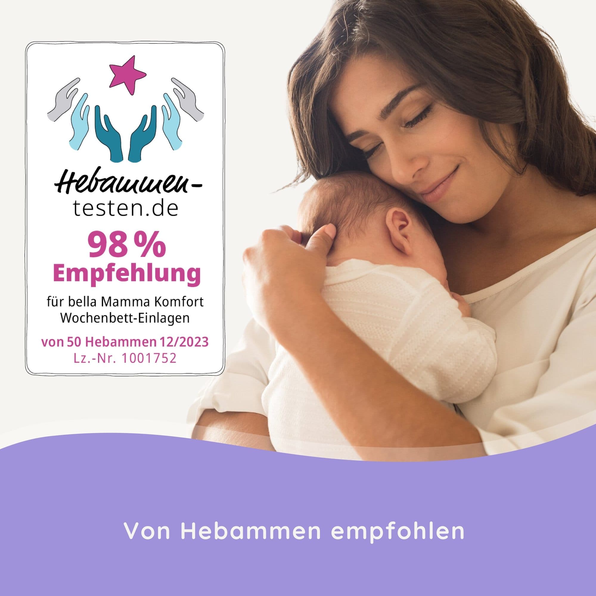 | Anwendungshinweis | Den Fixierstreifen von der Unterseite der Einlage abziehen. Die Einlage in die Unterwäsche oder in den bella mamma Wöchnerinnen-Slip mit dem Fixierstreifen nach unten einlegen und den vollen Tragekomfort genießen. bella mamma comfort Wochenbett- Einlagen sind Einwegprodukte, die je nach individuellem Bedarf gewechselt werden. Bitte nicht zerschneiden. Nach Gebrauch im Hausmüll entsorgen, nicht in die Toilette werfen. |