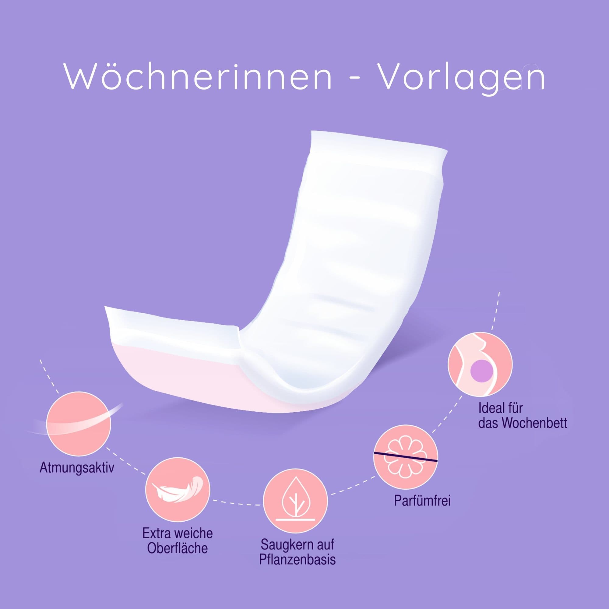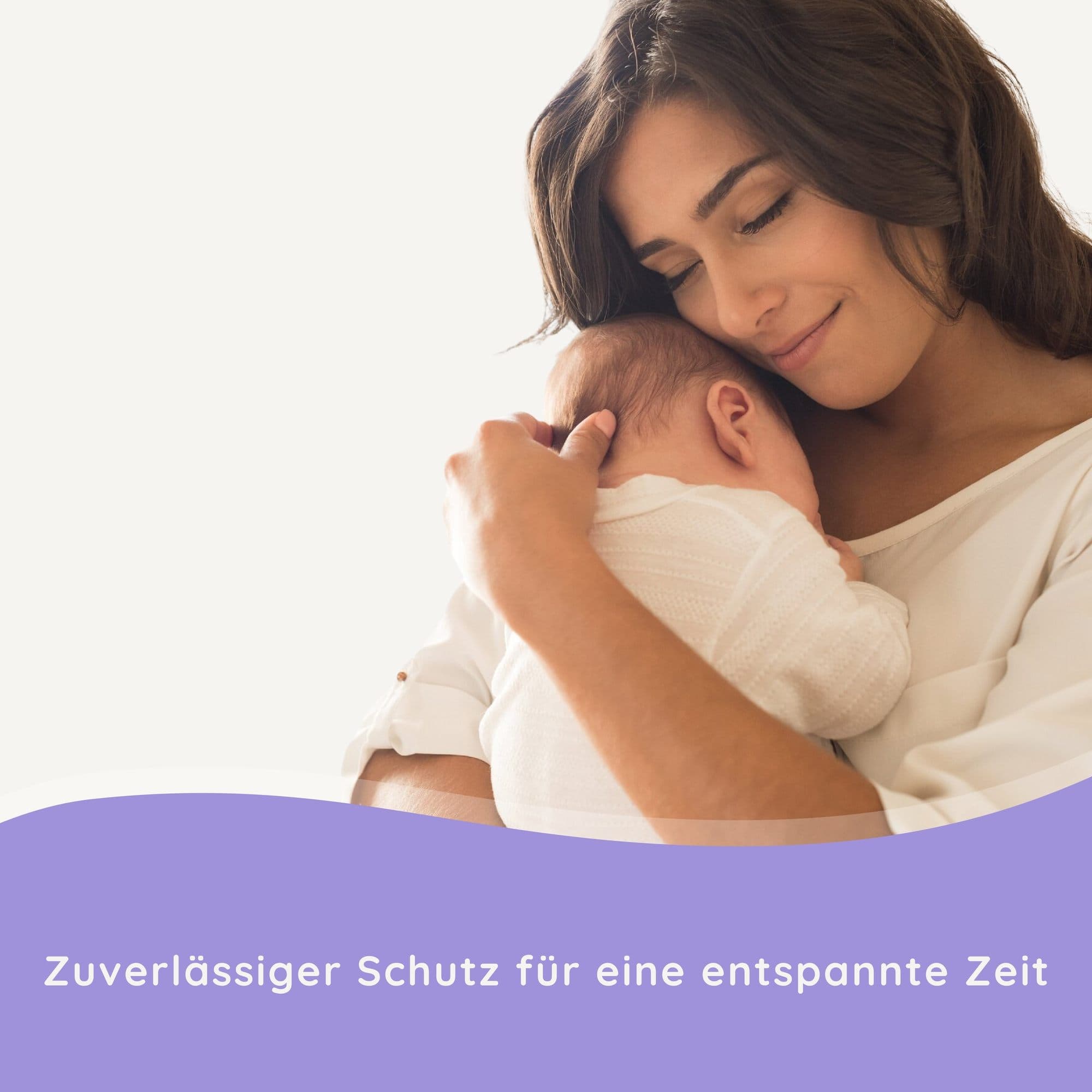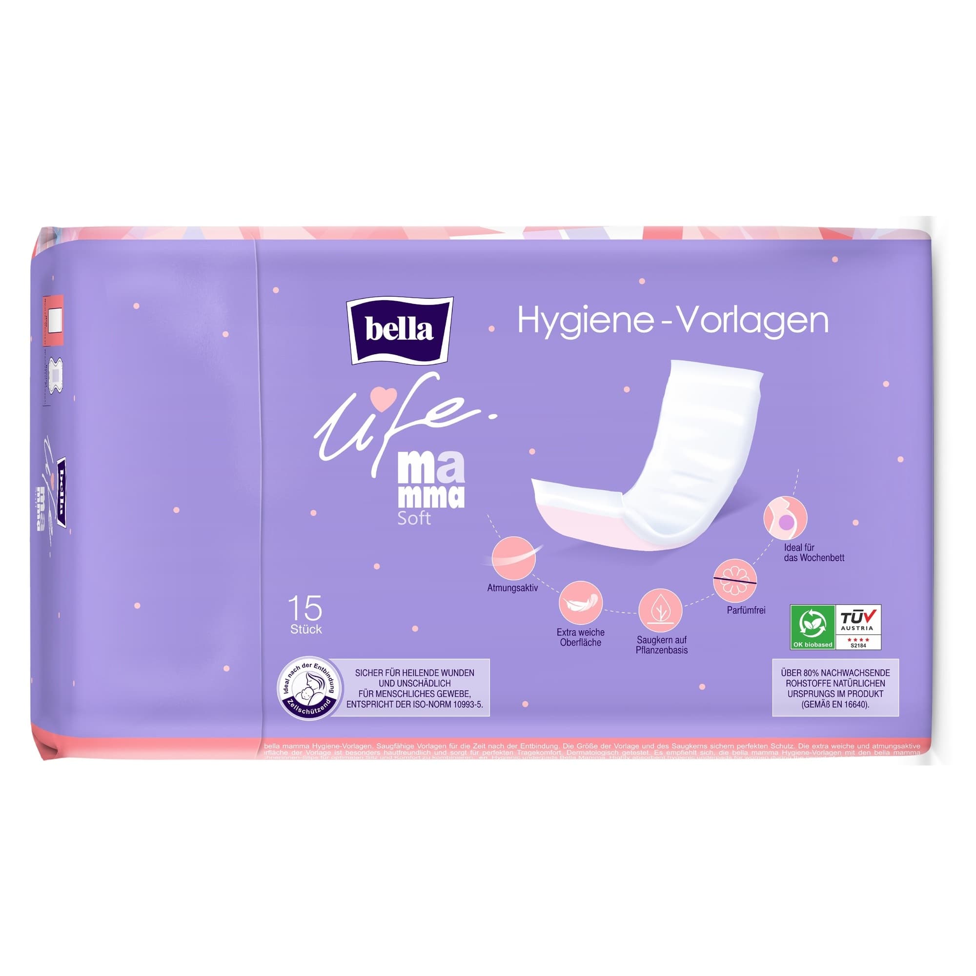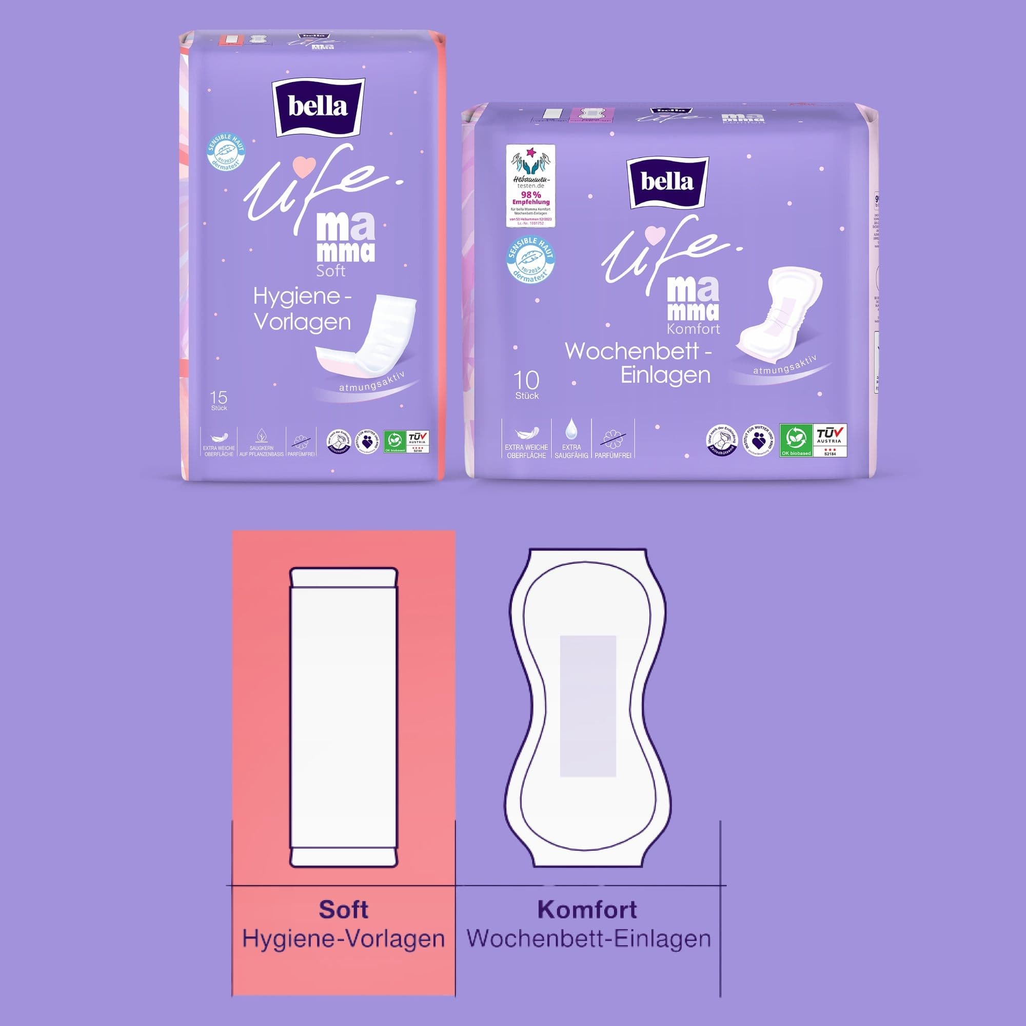 bella mamma Soft Hygiene-Vorlagen für Frauen im Wochenbett. Die weiche und zarte Oberfläche schützt vor Hautreizungen und garantiert einen optimalen Tragekomfort. Der saugfähige Kern der Einlage nimmt die Flüssigkeit schnell auf.