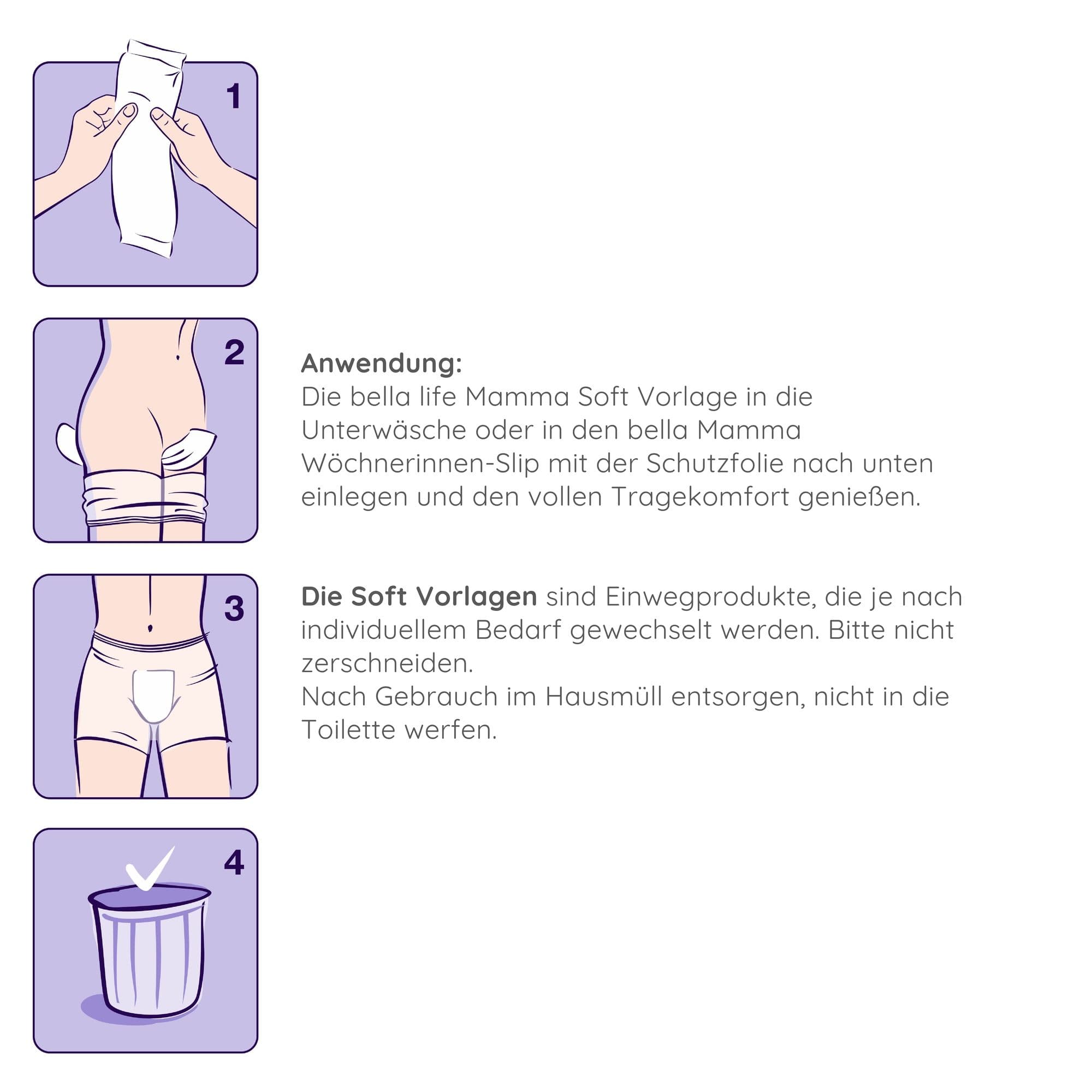| Anwendungshinweis | Die bella Mamma Hygiene-Vorlage in die Unterwäsche oder in den bella mamma Wöchnerinnen-Slip mit der Schutzfolie nach unten einlegen und den vollen Tragekomfort genießen. bella mamma Vorlagen sind Einwegprodukte, die je nach individuellem Bedarf gewechselt werden. Bitte nicht zerschneiden. Nach Gebrauch im Hausmüll entsorgen, nicht in die Toilette werfen. |