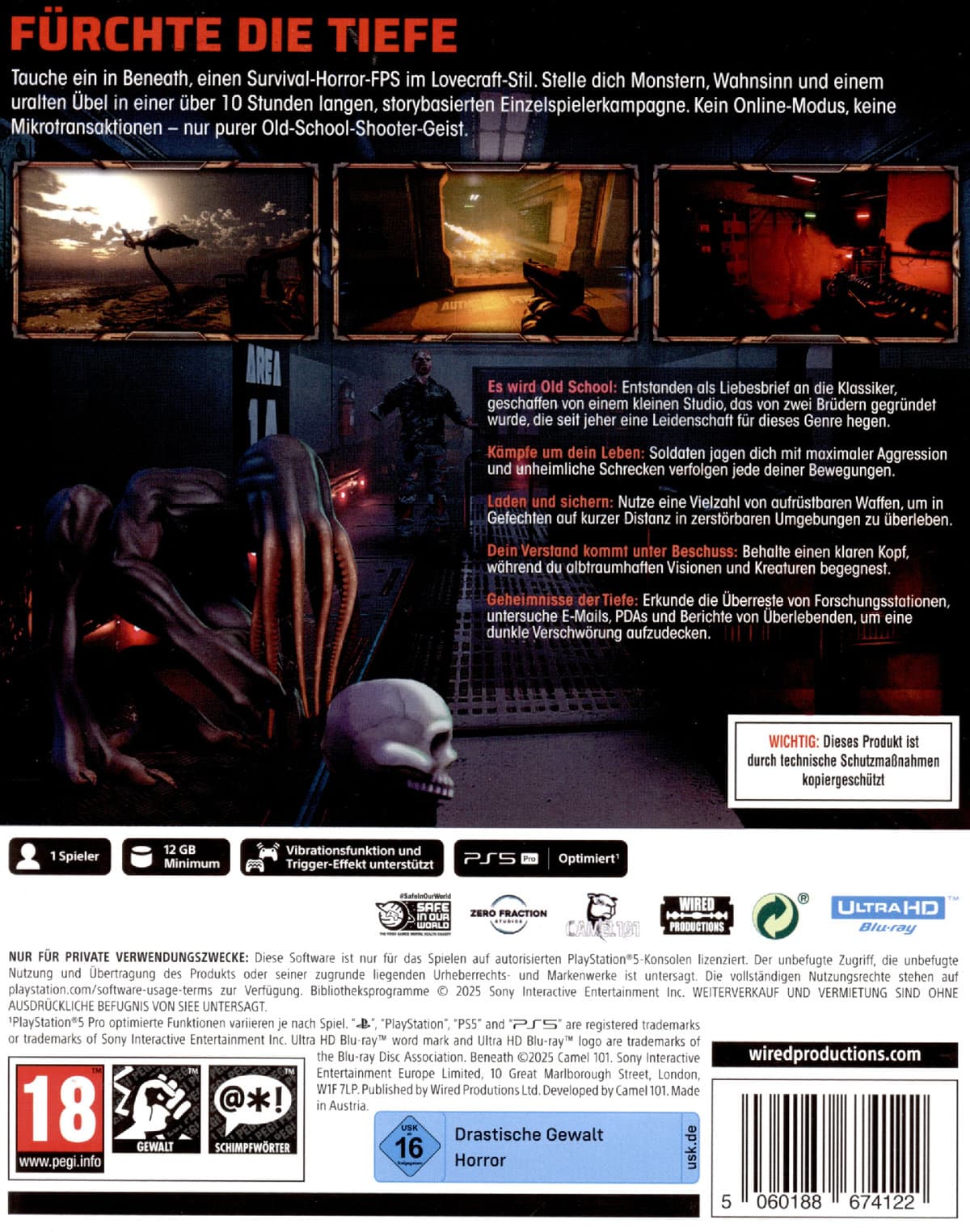 Steige in Beneath, einem Survival-Horror-Action-Adventure im Lovecraft-Stil aus der Ego-Perspektive, in den Abgrund hinab und stelle dich deinen tiefsten Ängsten. Die Routineexpedition des erfahrenen Tauchers Noah Quinn gerät ins Chaos und er wird in den Tiefen des Ozeans gefangen, wo ein uraltes Übel lauert. Die Vorräte gehen zur Neige und alptraumhafte Kreaturen nähern sich. Noah muss sich furchtbaren Mutationen, schleichendem Wahnsinn und einer finsteren Verschwörung stellen, die die Menschheit bedroht. Das Leben seiner Tochter steht auf dem Spiel und Noah kommt bei einem verzweifelten Wettlauf gegen die Zeit an seine Grenzen. Kann er die Wahrheit aufdecken und verhindern, dass ein uralter Schrecken an die Oberfläche kommt, oder wird der Abgrund alle verschlingen? Horror im Lovecraft-Stil: Tauche ein in einen schaurigen Alptraum im Lovecraft-Stil, in dem dich eine stimmungsvolle Welt voller unheimlicher Abscheulichkeiten in die Falle locken will. Enthülle eine packende Geschichte voller Geheimnisse, Spannung und schockierenden Wendungen, die dich in Atem halten wird. Ressourcenmanagement: Bewältige die Tauchfahrt mit knappen Vorräten und schwindender Munition. Dein Verstand ist dein wertvollstes Gut. Du stehst am Rande des Abgrunds, und die Schrecken der Tiefe bedrohen deinen Geist und Körper. Tarnung und Kampf: Begib dich in die Schatten und bleibe unentdeckt, um Ressourcen zu sparen, oder löse Chaos mit adrenalingeladenen Feuergefechten aus, wenn du tiefer in das finstere Geheimnis eintauchst. Fortgeschrittene Gegner: Stelle dich einer furchterregenden Schar von Feinden, von skrupellosen menschlichen Soldaten bis hin zu grotesken Monstrositäten im Lovecraft-Stil. Erlerne ihre Taktiken und meistere Kampf und Tarnung, um zu überleben. Verschiedene Orte zum Erkunden: Rüste dich mit einem speziellen Tiefseetauchanzug aus, aber achte auf die Sauerstoffgrenze, wenn du in die Tiefen des Ozeans eintauchst. Enthülle die Geheimnisse von Tiefseeforschungsstationen und navigiere mit deinem U-Boot durch die tückischen Gewässer des Atlantiks.