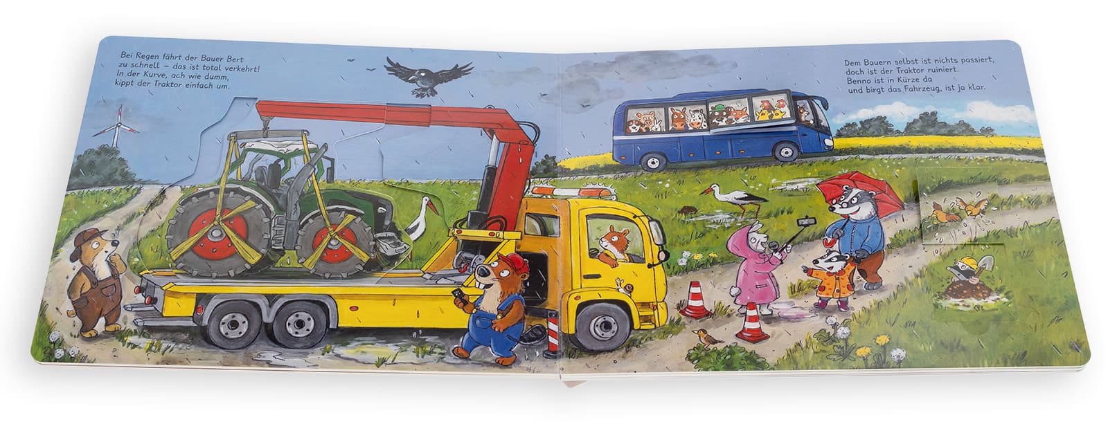 Da sind sie alle: Bauer Bert mit seinem Traktor, Emil Wildschwein mit der Walze, Greta Gans mit dem Polizeiauto und Kater Kalle mit seinem Feuerwehrauto. Doch die Fahrzeuge haben auf der Straße eine Panne. An der Walze platzt der Reifen, der Traktor kippt aus der Kurve, das Polizeiauto verliert Öl und der Motor des Feuerwehrautos fängt tatsächlich an zu qualmen. Kein Problem für Benno Biber! Der kommt mit seinem Abschleppwagen und bringt alle kaputten Fahrzeuge zur Autowerkstatt von Freddy Fuchs.